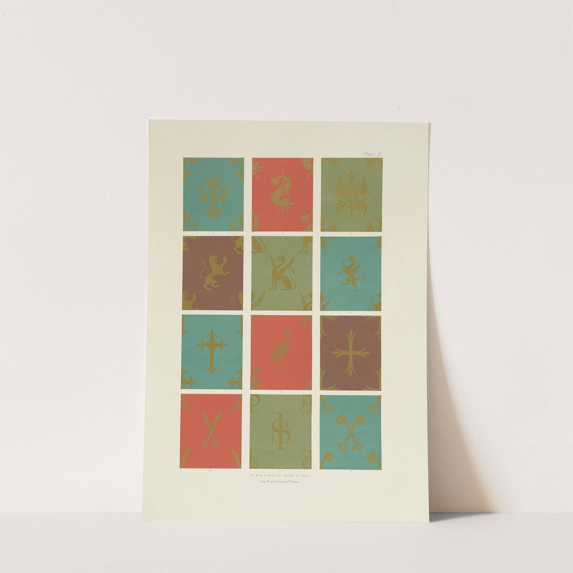 This art print features a grid of nine colorful squares, each showcasing a different heraldic symbol in varying colors and patterns. The top row consists of three squares: one with a gold fleur-de-lis on a blue background, another with a...