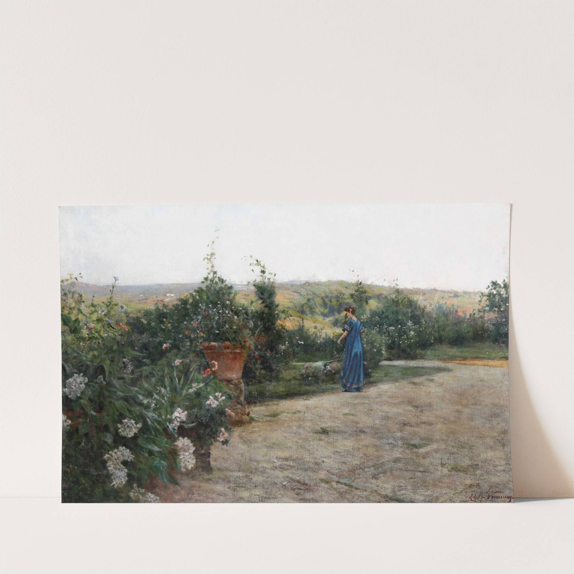 This enchanting artwork titled "Pomeriggio in Villa" by Adolfo Tommasi captures a serene moment in a lush garden setting. The painting features a woman dressed in a rich blue dress with subtle lace detailing, standing gracefully amidst the verdant surroundings....