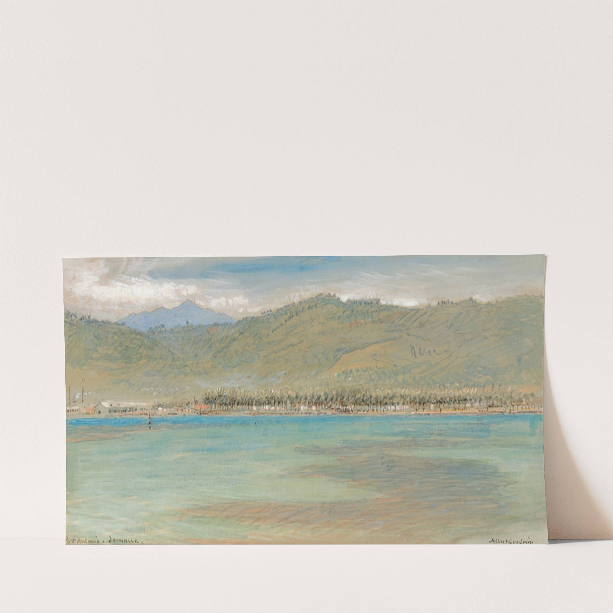This beautifully painted landscape print by Albert Goodwin titled "Port Antonio, Jamaica" captures the serene beauty of a tropical coastal scene. The composition features a tranquil turquoise sea in the foreground that gently transitions into deeper blues as it approaches...