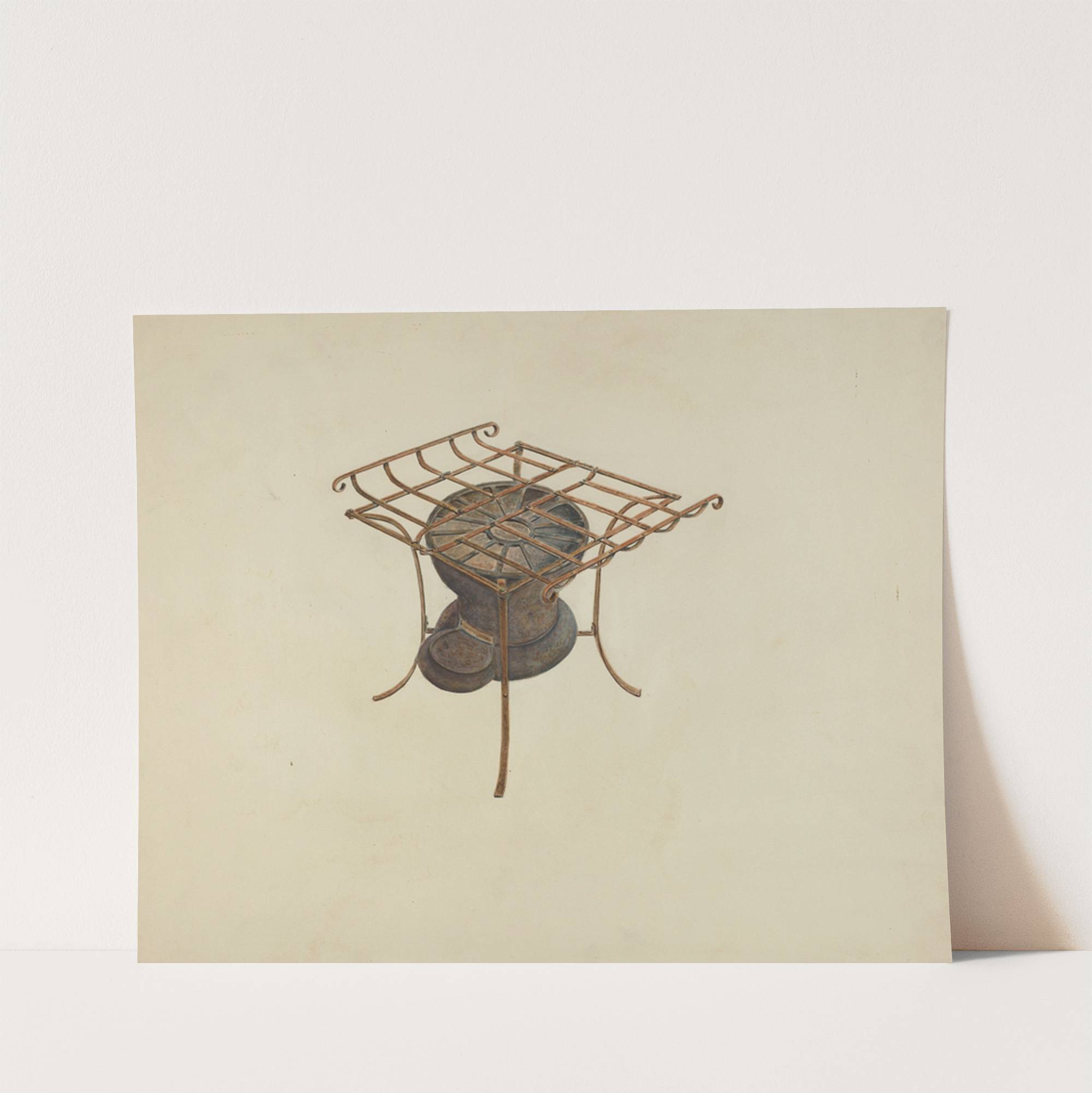 This charming art print features "Portable Cast Iron Cook Stove" by artist Al Curry. The piece showcases an intricately detailed cast iron cooking stove with rustic charm. The stove is depicted in rich, rusty orange tones, highlighting the wear and...