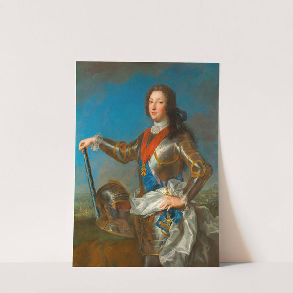 This elegant portrait titled "Portrait de Louis, duc d'Orléans" by Alexis Simon Belle showcases a refined historical figure in opulent military attire. The subject is depicted in full plate armor, adorned with intricate silver details and accents that catch the...