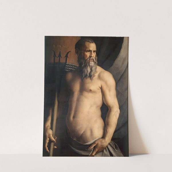 This captivating artwork features "Portrait of Andrea Doria as Neptune" by Agnolo Bronzino. The painting depicts a muscular, bearded man standing with a confident gaze, embodying the mythological figure of Neptune. His strong, defined muscles are prominently displayed, with his...