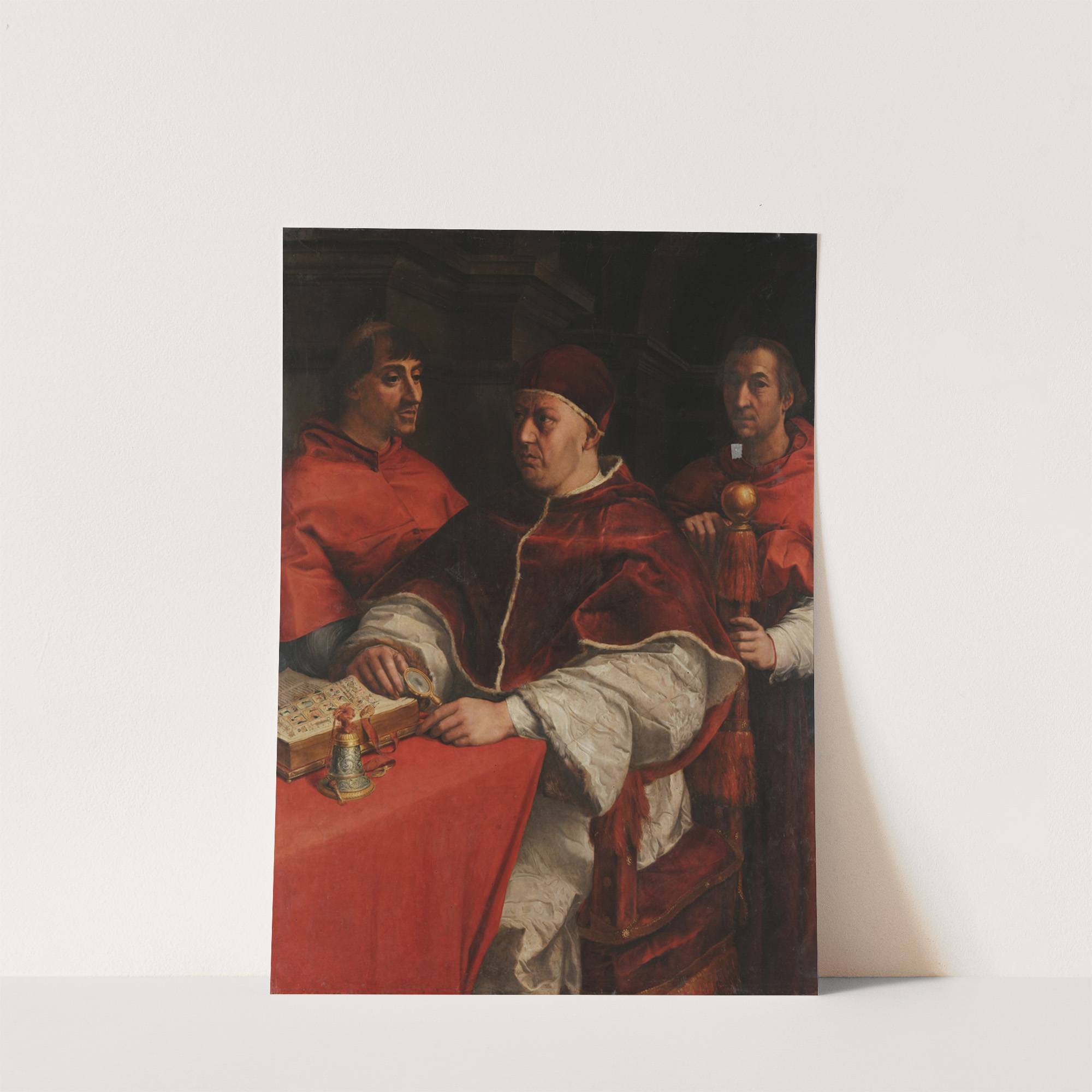This art print features "Portrait of Leo X with Cardinals Giulio de' Medici and Luigi de' Rossi" by Andrea del Sarto, a renowned Italian Renaissance artist. The composition centers around Pope Leo X, who is adorned in rich, dark red...