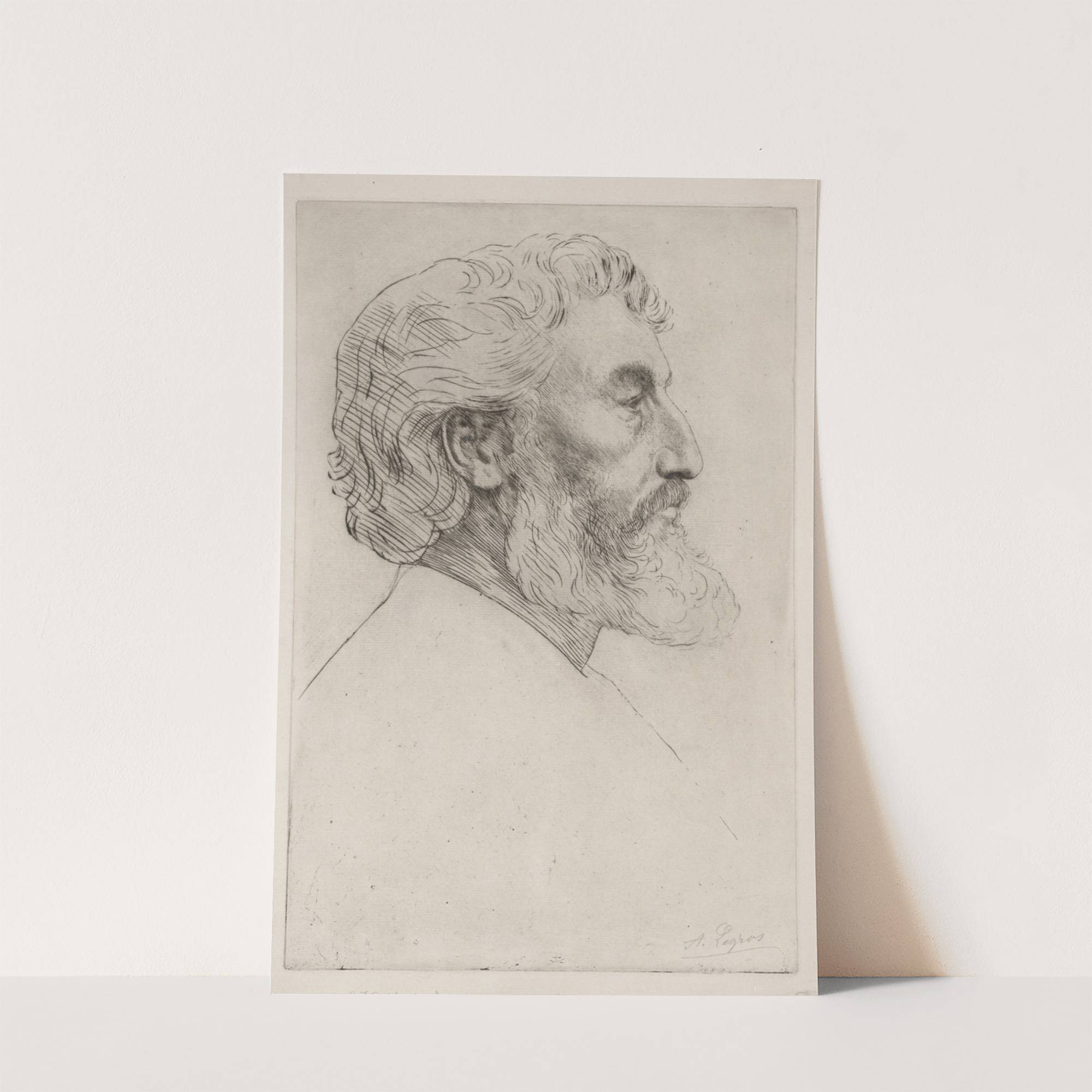 This exquisite black-and-white illustration depicts Sir Frederick Leighton in profile, capturing his dignified presence with meticulous detail. Rendered in fine pencil strokes, the artist masterfully highlights the contours and textures of his wavy hair and full beard, which cascade naturally...