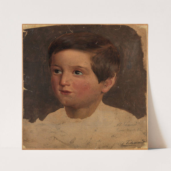 This classic oil painting features a delicate portrait of a young boy rendered in warm, earthy tones. The artist, Adolph Tidemand, captures the child's gentle expression with remarkable precision. The boy’s light brown hair is softly combed to one side,...