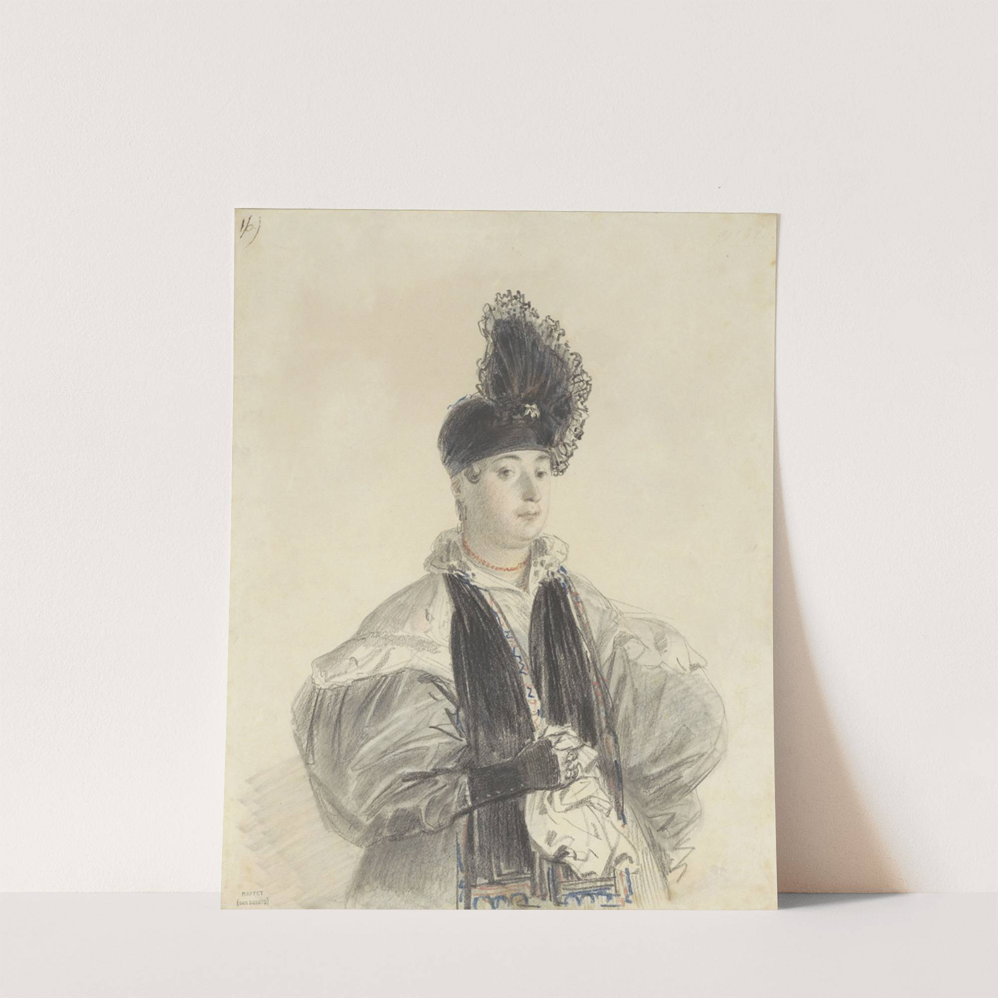 Portret van een staande dame met zwarte shawl en zwarte hoed by Denis Auguste Marie Raffet - Wall Art Print