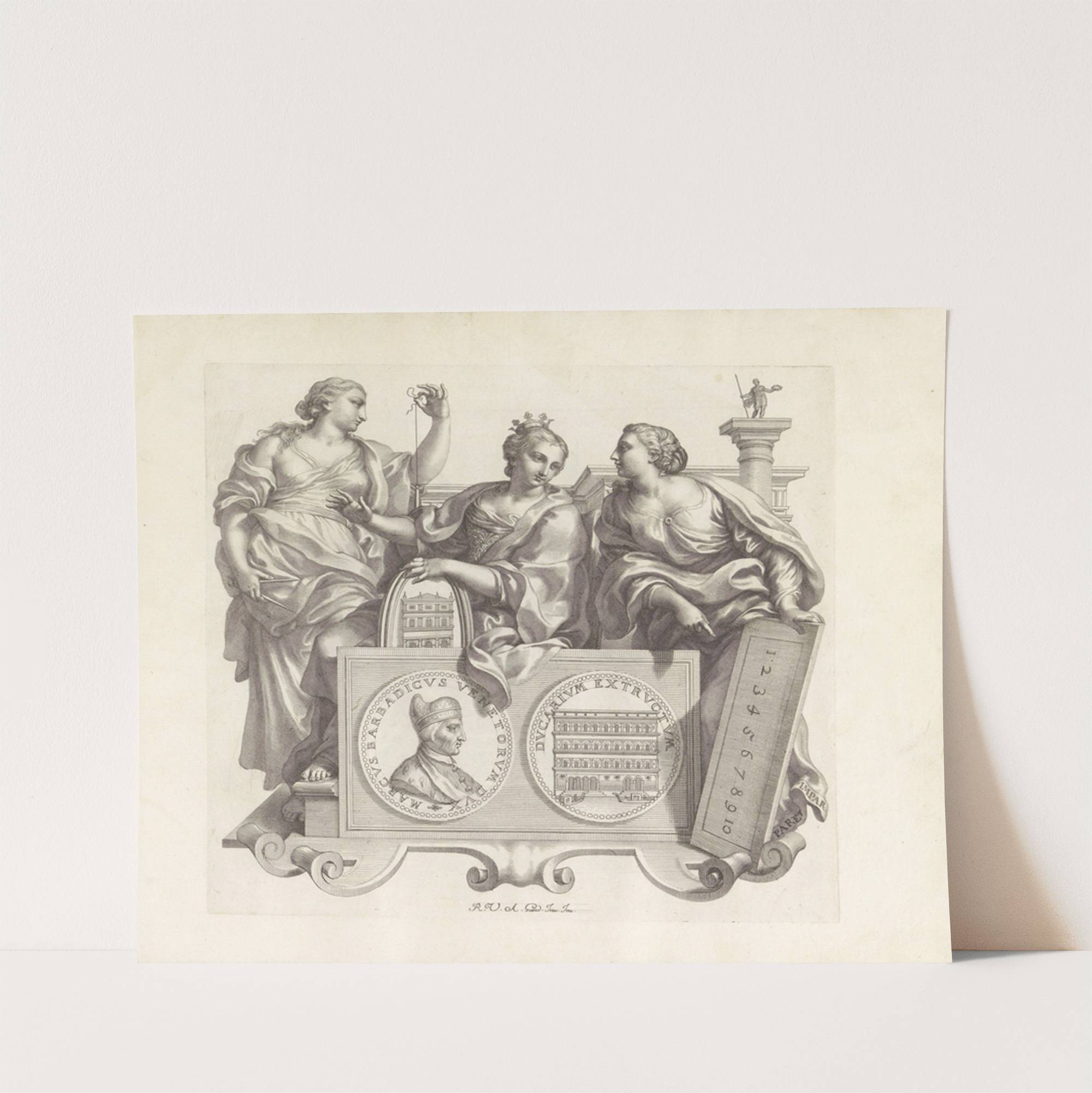 Portret van Marco Barbarigo en de personificaties van Meetkunst, Pracht en Rekenkunst (1673-1743) by Robert van Audenaerde - Wall Art Print