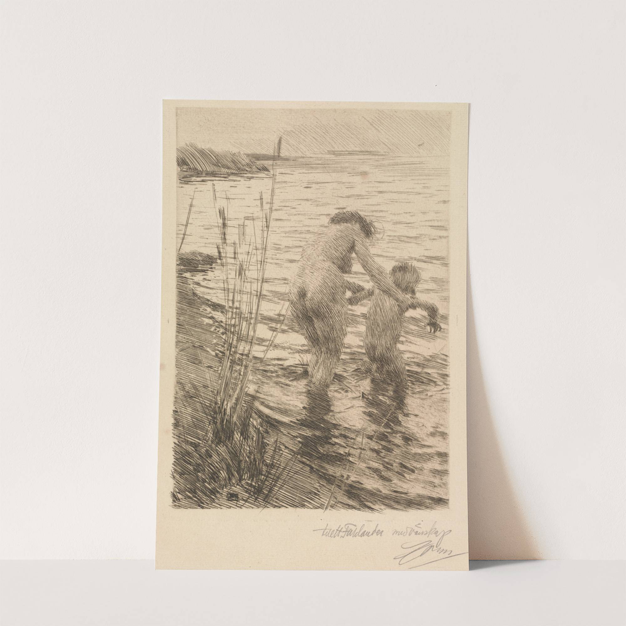 This artwork titled "Première" by Anders Zorn presents a captivating monochromatic etching that showcases the tender interaction between two figures by a serene lakeside setting. The scene is rendered in delicate cross-hatching, creating a textured effect that emphasizes light and...