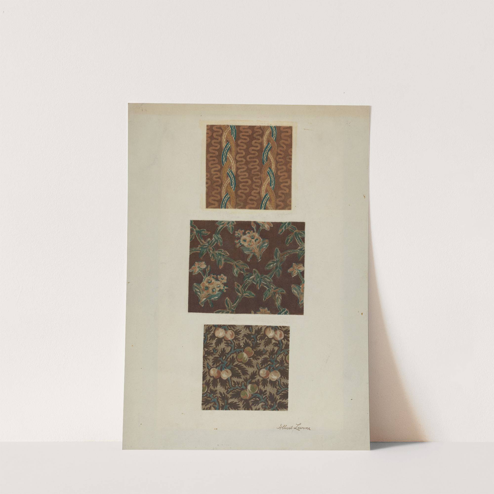 This art print features three vibrant textile squares arranged vertically against a white background. Each square showcases unique patterns and designs with rich coloration and intricate detail.The topmost square presents a repetitive, wavy pattern in earthy browns with teal accents...