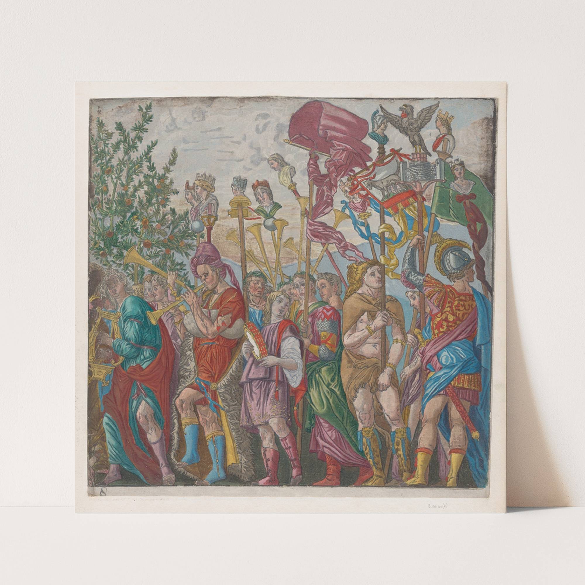 This vibrant artwork is titled "Procession of Musicians and others holding Standards" by Andrea Mantegna, a renowned master of Renaissance art. The piece showcases an elaborate procession featuring a group of elaborately dressed musicians, soldiers, and other figures in colorful...