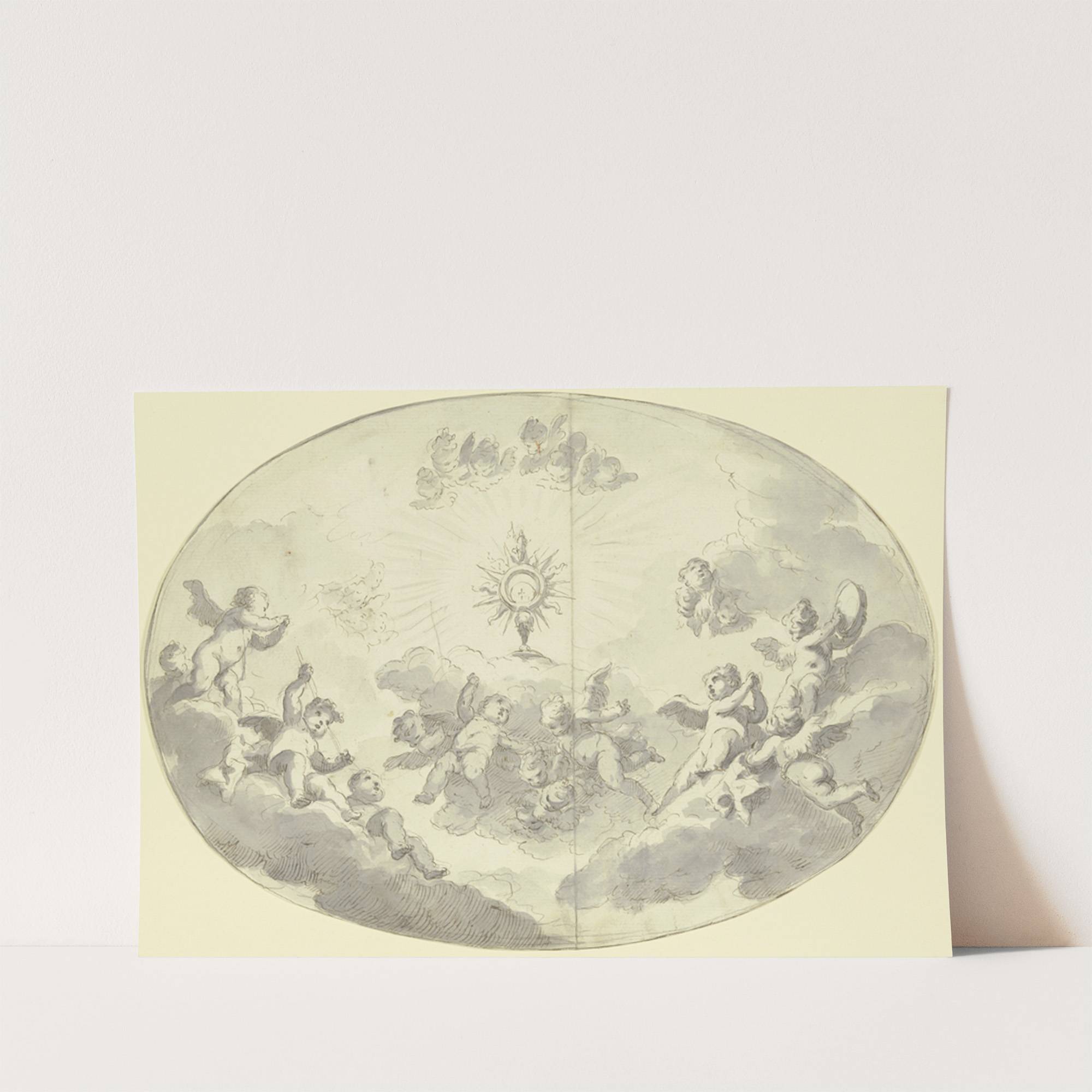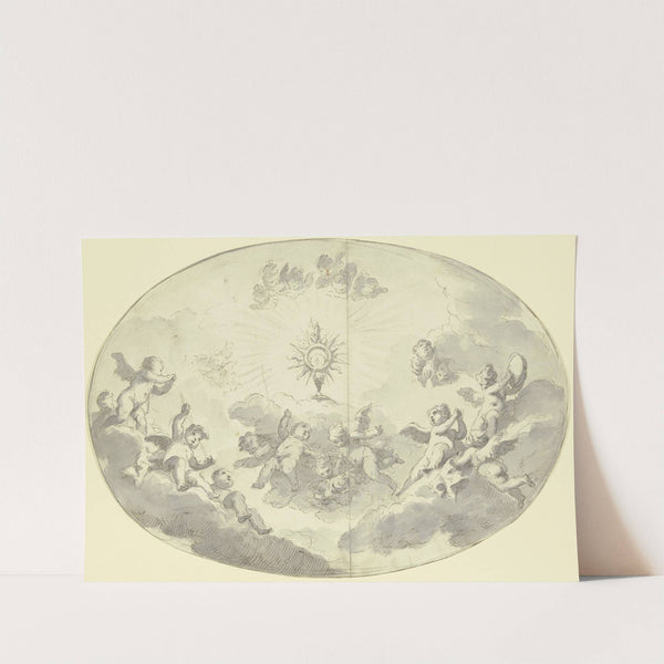 This art print features "Putten verehren das heilige Sakrament" by Gaspare Diziani, showcasing a classic Baroque-style celestial scene. The composition is oval-shaped and rendered in delicate monochromatic tones of gray and white. At the center is a radiant sun with...