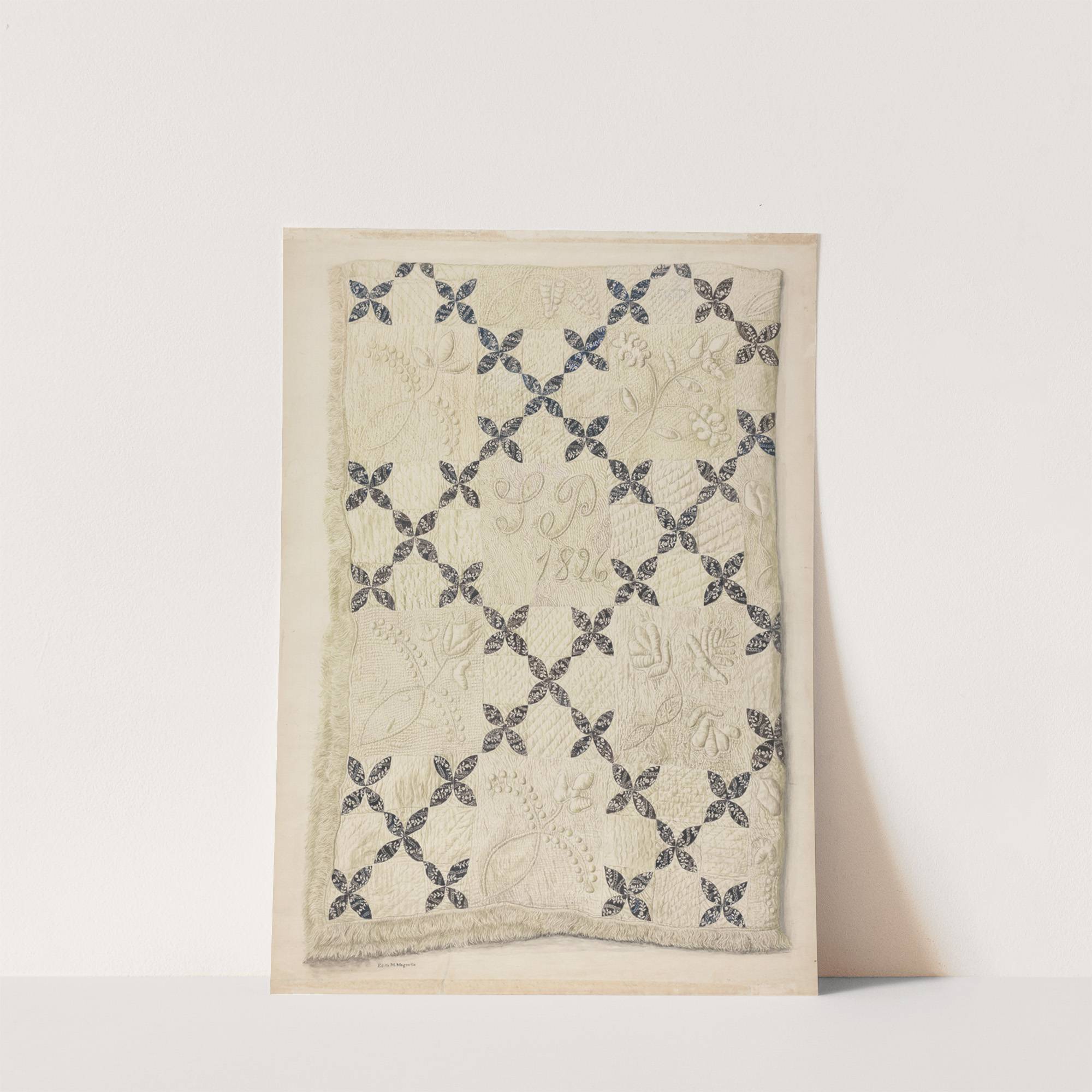 This art print showcases "Quilt by Edith Magnette," a beautifully intricate piece that combines elegance and craftsmanship. The quilt features a classic diamond pattern created with delicate blue floral embroidery against a pristine white background. Each diamond is meticulously outlined...