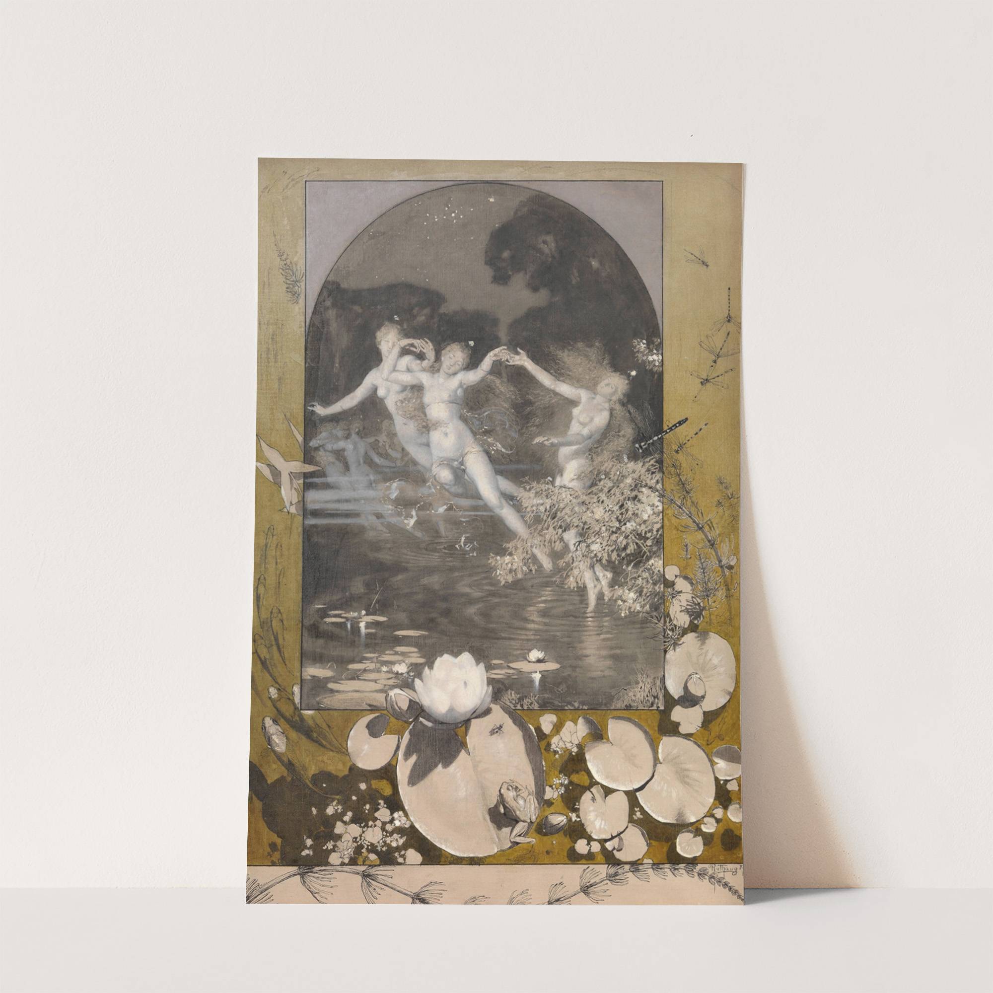 This art print showcases "Tanz, Musik, Liebe" by Alexander Rothaug, characterized by its ethereal beauty and intricate detailing. The centerpiece of the composition features two delicate, ghostly figures dancing gracefully in a serene, reflective body of water, set against an...
