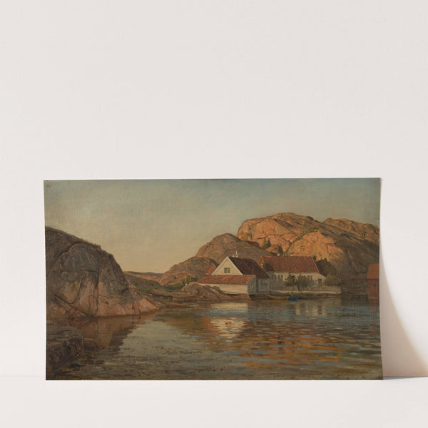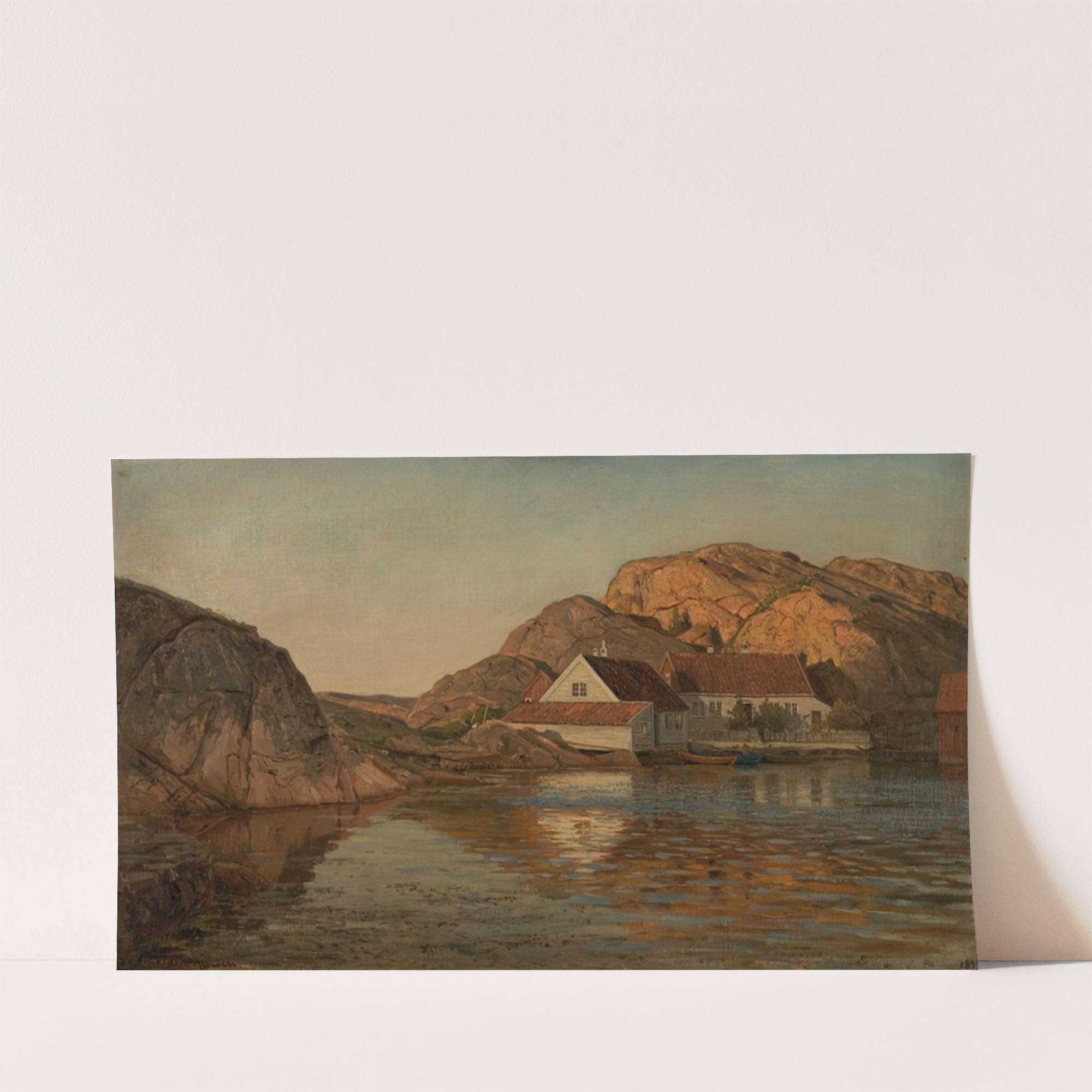 This captivating art print features "Renneholmen, Ny-Hellesund (1899)" by renowned artist Amaldus Nielsen. The painting is a beautifully rendered landscape that showcases a serene coastal village nestled among rugged rocky terrain. Dominating the scene is a quaint white church with...