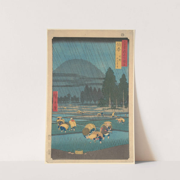This print depicts a serene rural scene titled "Rice Planting under Rain at Ono, Hoki Prefecture" by the renowned artist Andō Hiroshige. The artwork showcases a group of farmers diligently planting rice in a lush green field under a gentle...