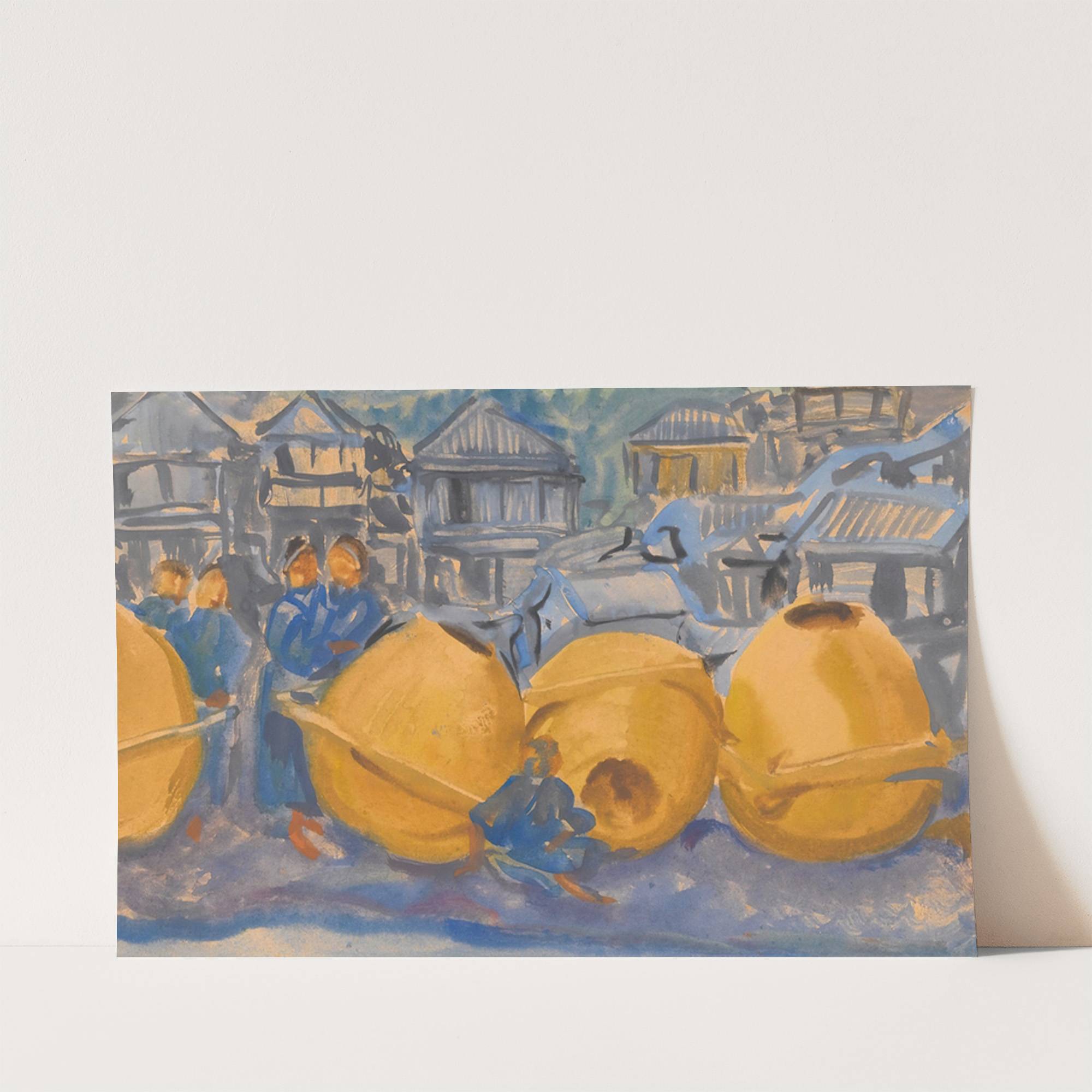 This vibrant art print titled "Rice Pots" by Alexandre Jacovleff showcases a lively scene filled with vivid colors and dynamic brushwork. The foreground features several large yellow rice pots, their round shapes and bright hue contrasting against the cooler tones...