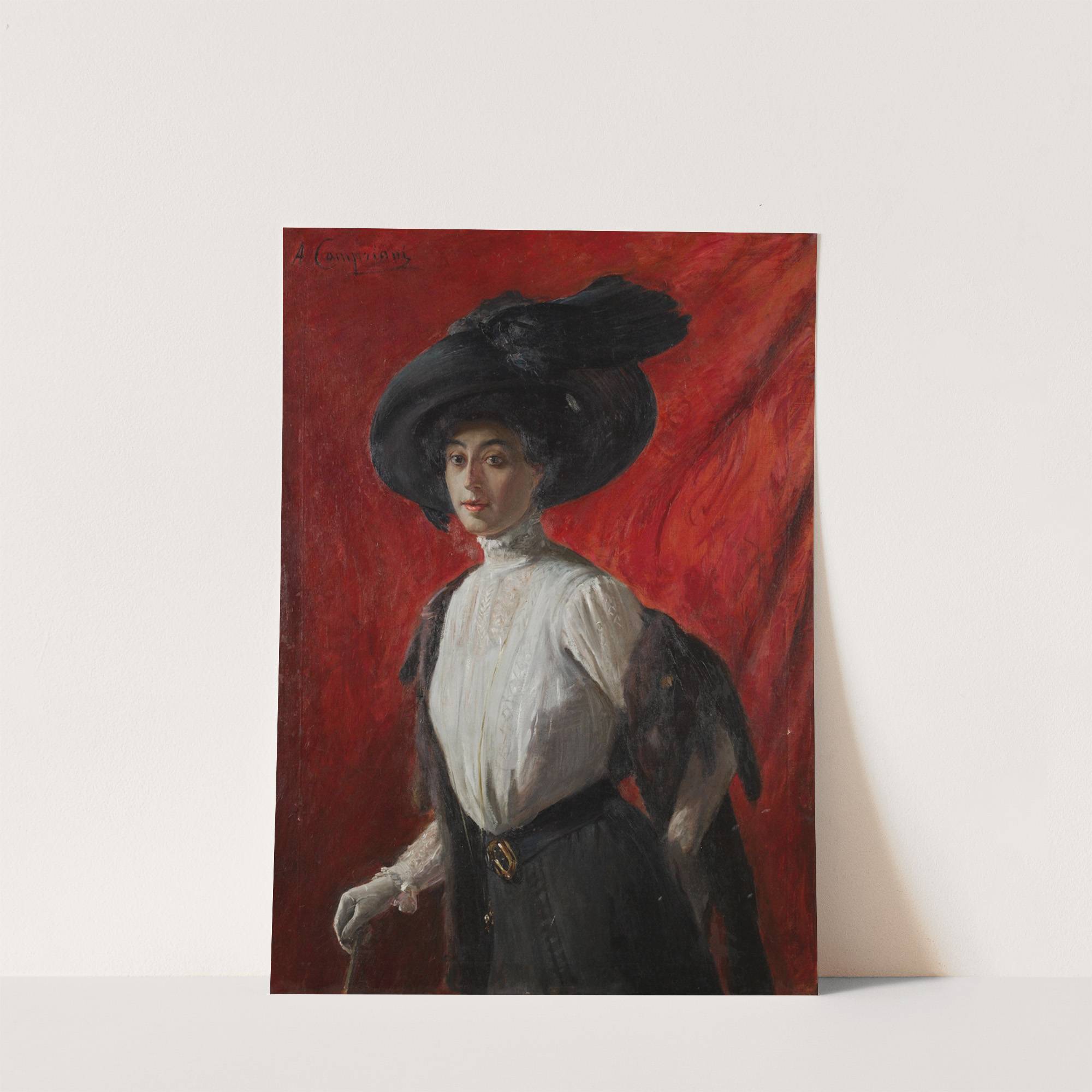 This exquisite portrait painting depicts a young woman with an elegant presence. The artist has meticulously captured her in a classic style, reminiscent of late 19th-century European art. The subject's delicate features are softly illuminated against a rich, crimson red...