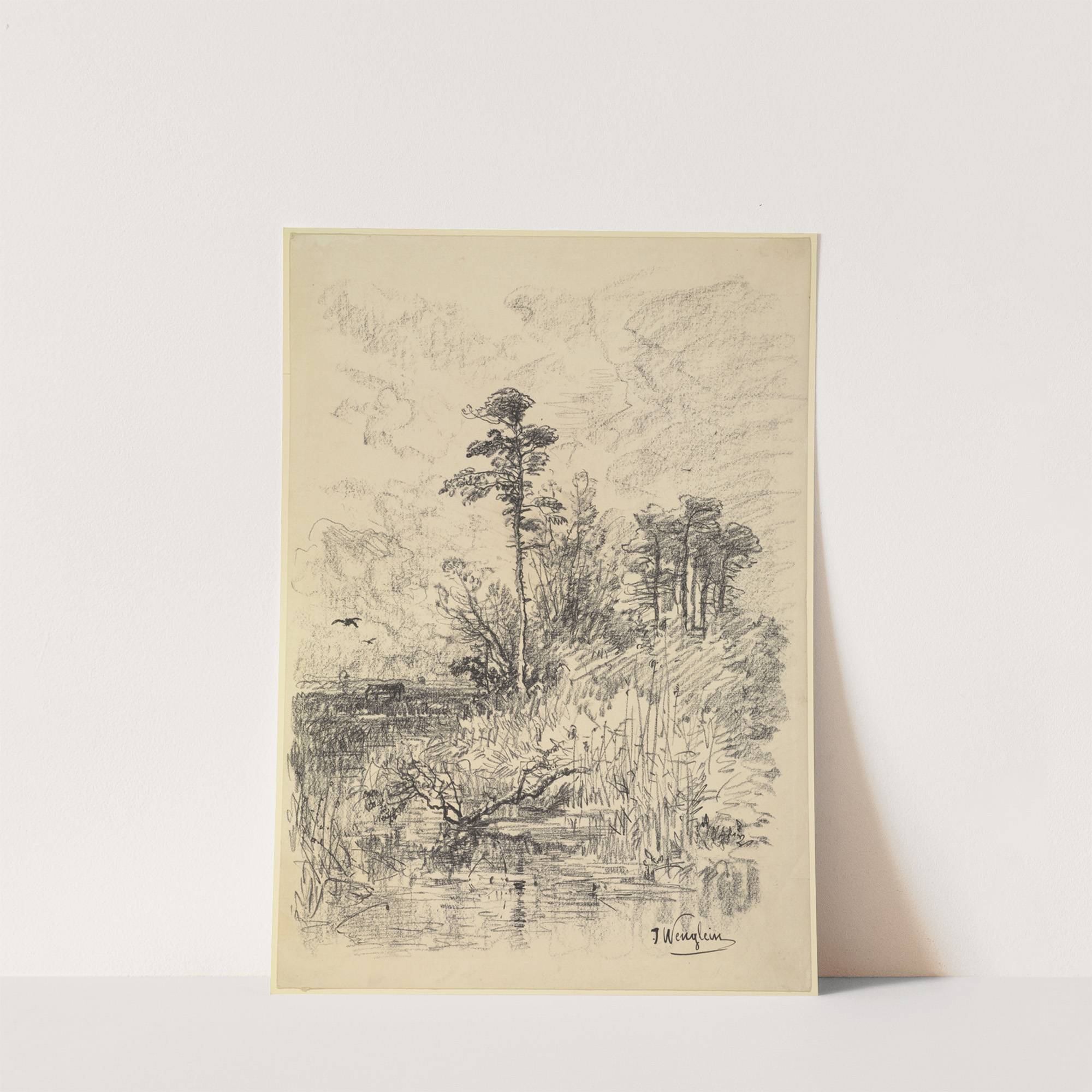 This monochromatic artwork titled "River Landscape" by Josef Wenglein exudes a serene atmosphere with its delicate pencil sketches on white paper. The composition features tall, slender trees standing gracefully along the riverbank, their branches reaching upwards towards a slightly hazy...