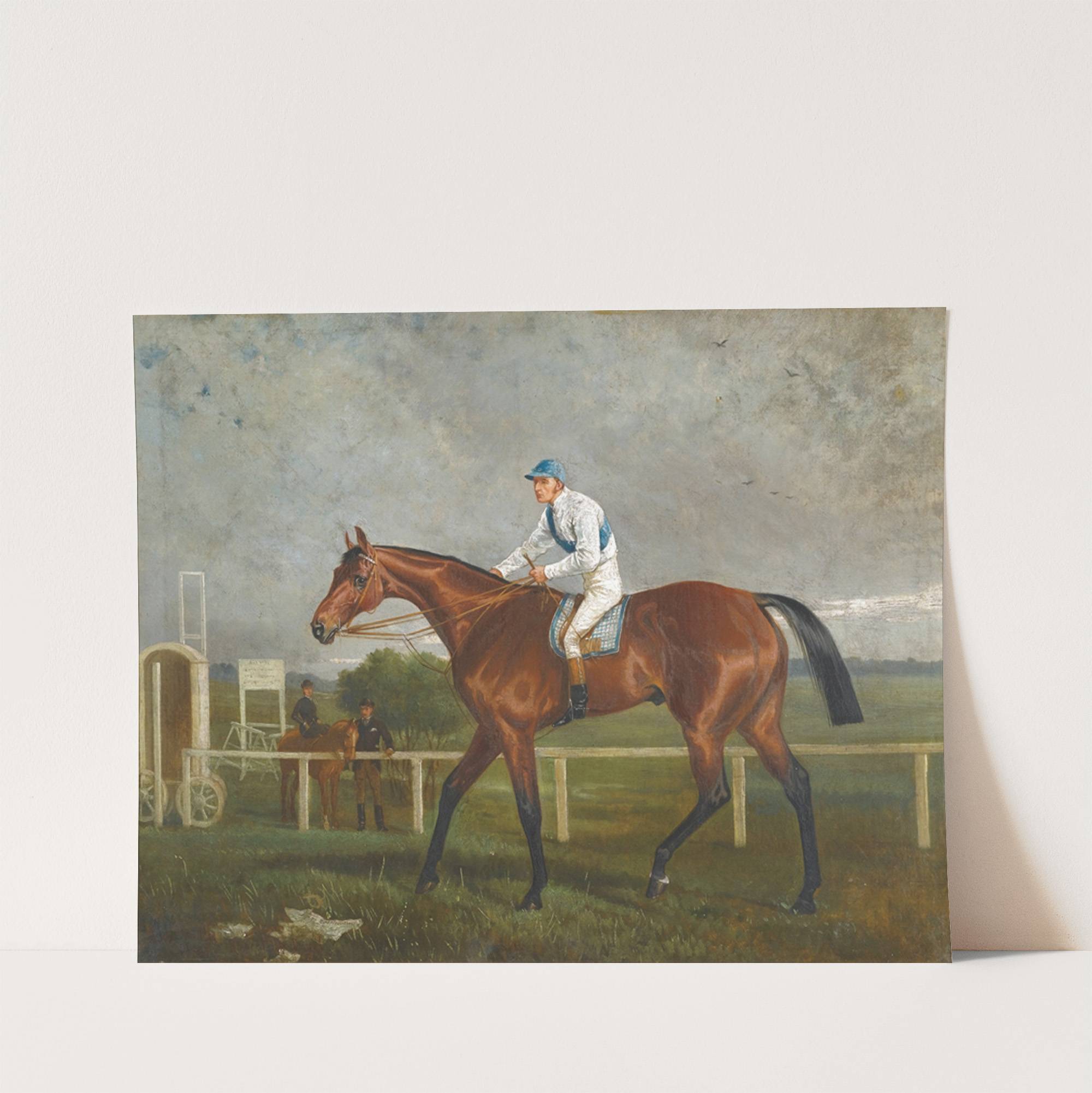 Experience the elegance of equestrian life with "Robert The Devil" by Alfred Frank de Prades. This captivating painting captures a moment at a horse racing event. At the forefront is a distinguished jockey, dressed in a crisp white jacket and...
