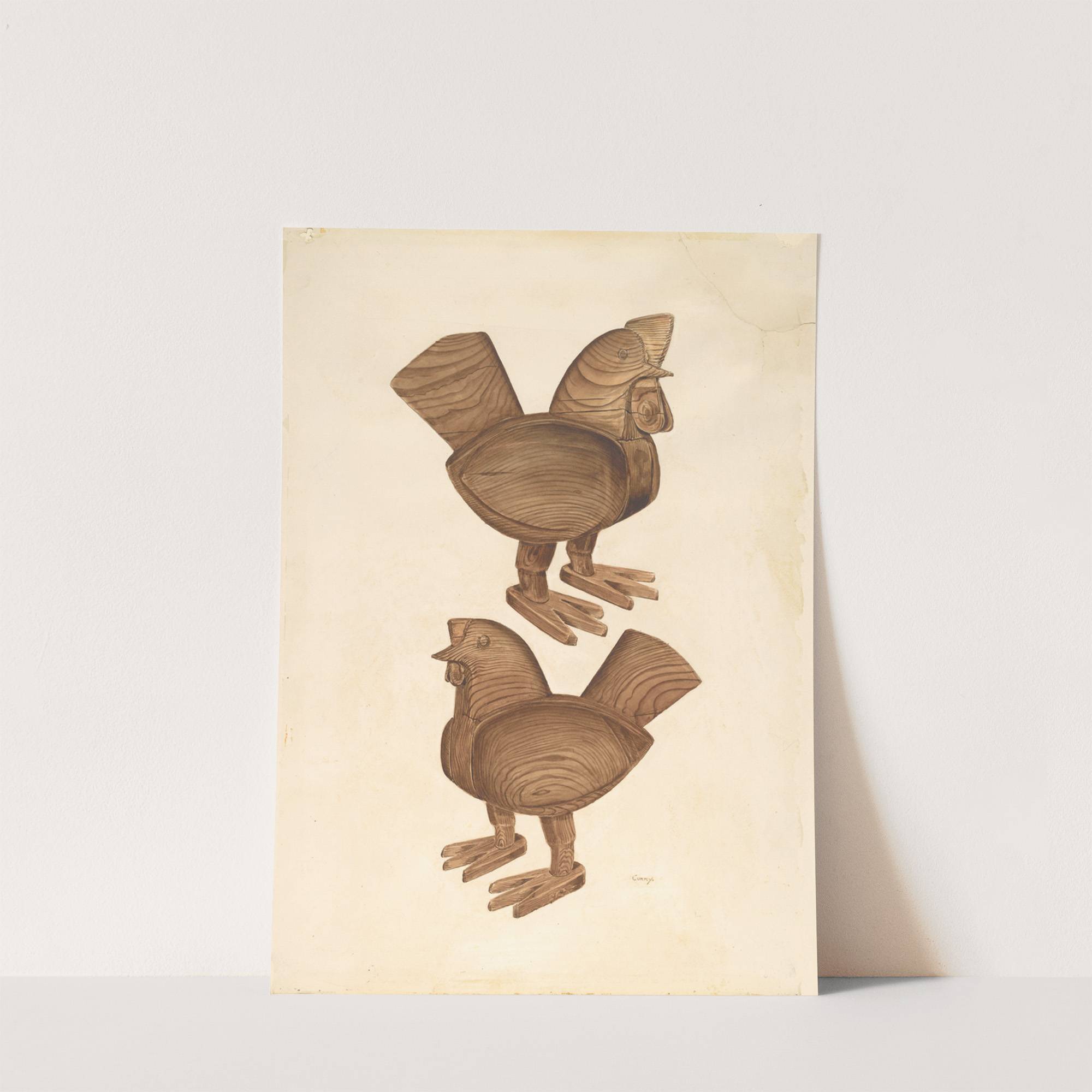 This art print showcases two intricately detailed wooden roosters, skillfully carved to capture their natural elegance. Each rooster is meticulously crafted with lifelike wood grain patterns, highlighting the texture and depth of the wood. The birds are positioned vertically, one...