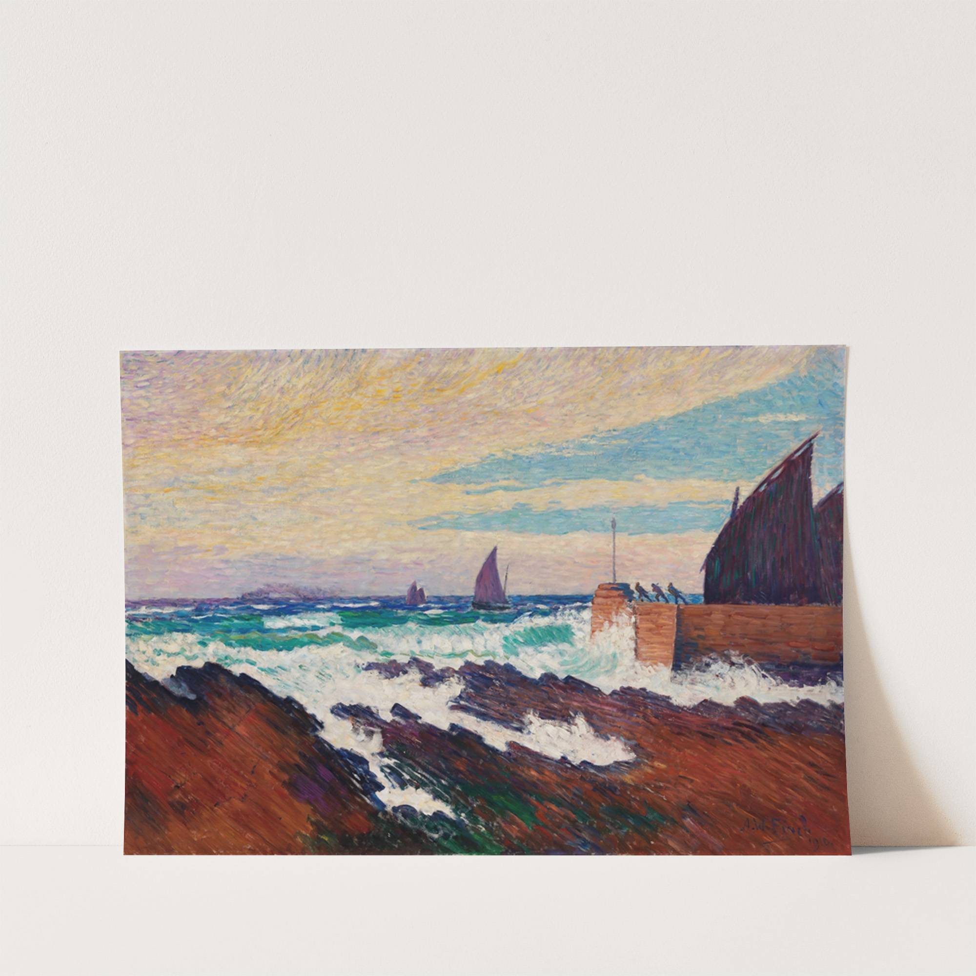 This vibrant art print features "Rosehearty Pier" by Alfred William Finch, capturing the dynamic energy of a seaside scene with stunning detail and color. The composition showcases a rocky coastline bathed in rich hues of red, brown, and black, contrasted...