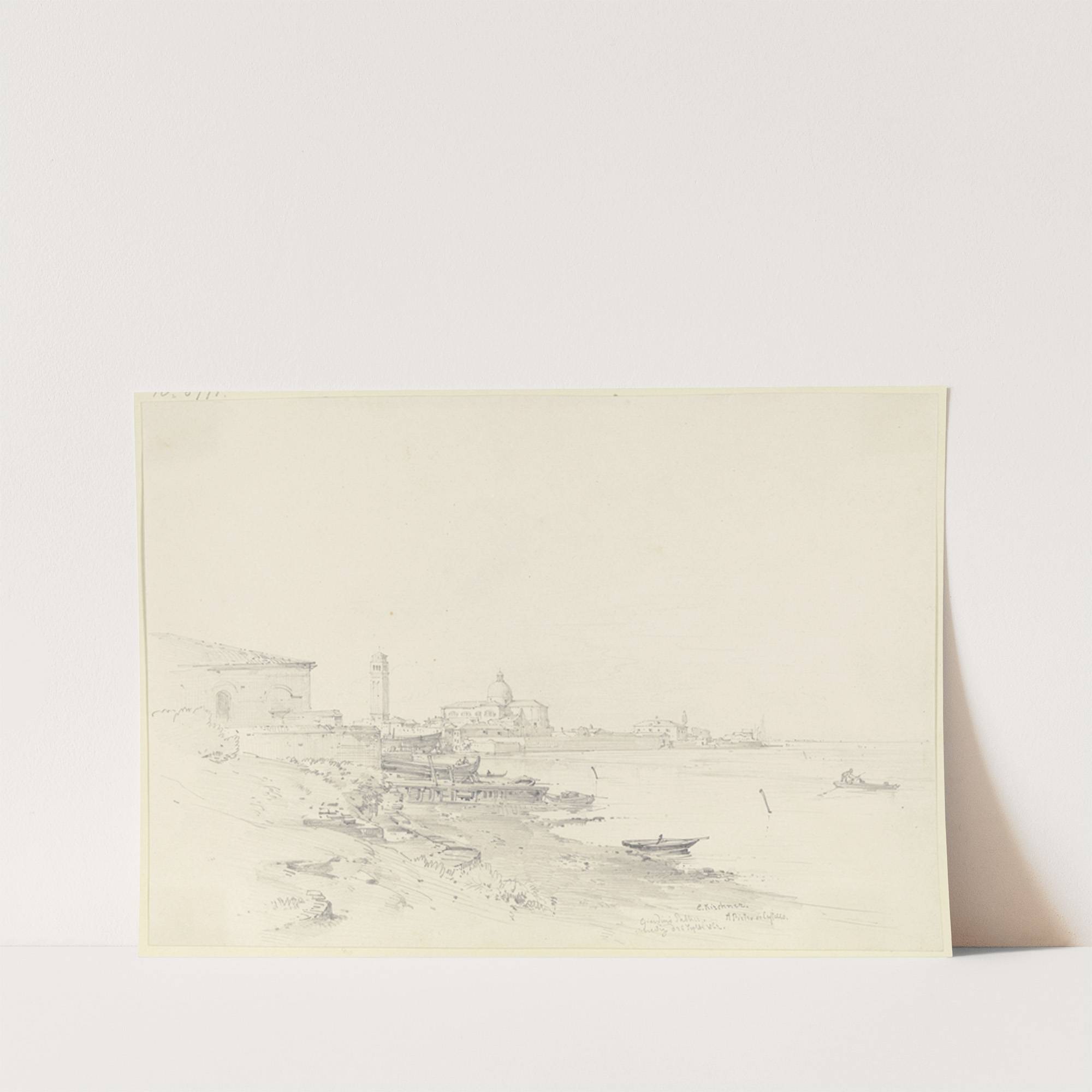 This striking black-and-white illustration depicts a serene maritime scene titled "S. Pietro di Castello in Venedig, vom Giardino Publico aus gesehen" by artist Albert Emil Kirchner. The artwork showcases a calm waterfront view with intricate line work that captures the...