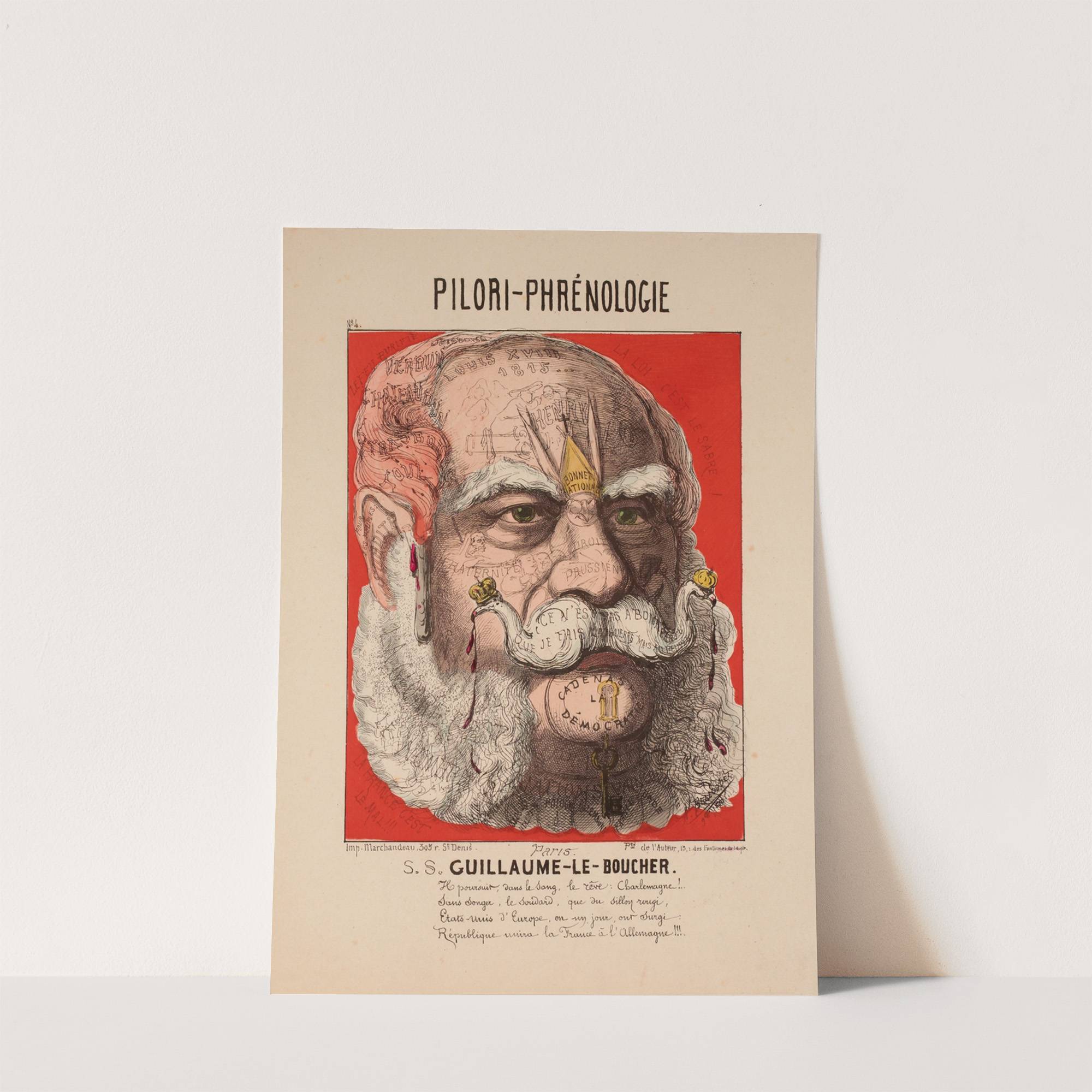 This vibrant print showcases the caricature "Pilori-Prenologie," created by the artist Achille Beloche in 1870. The centerpiece of the print is a strikingly detailed, full-face depiction of an elderly man with a prominent bald head and exaggerated, white, bushy beard....