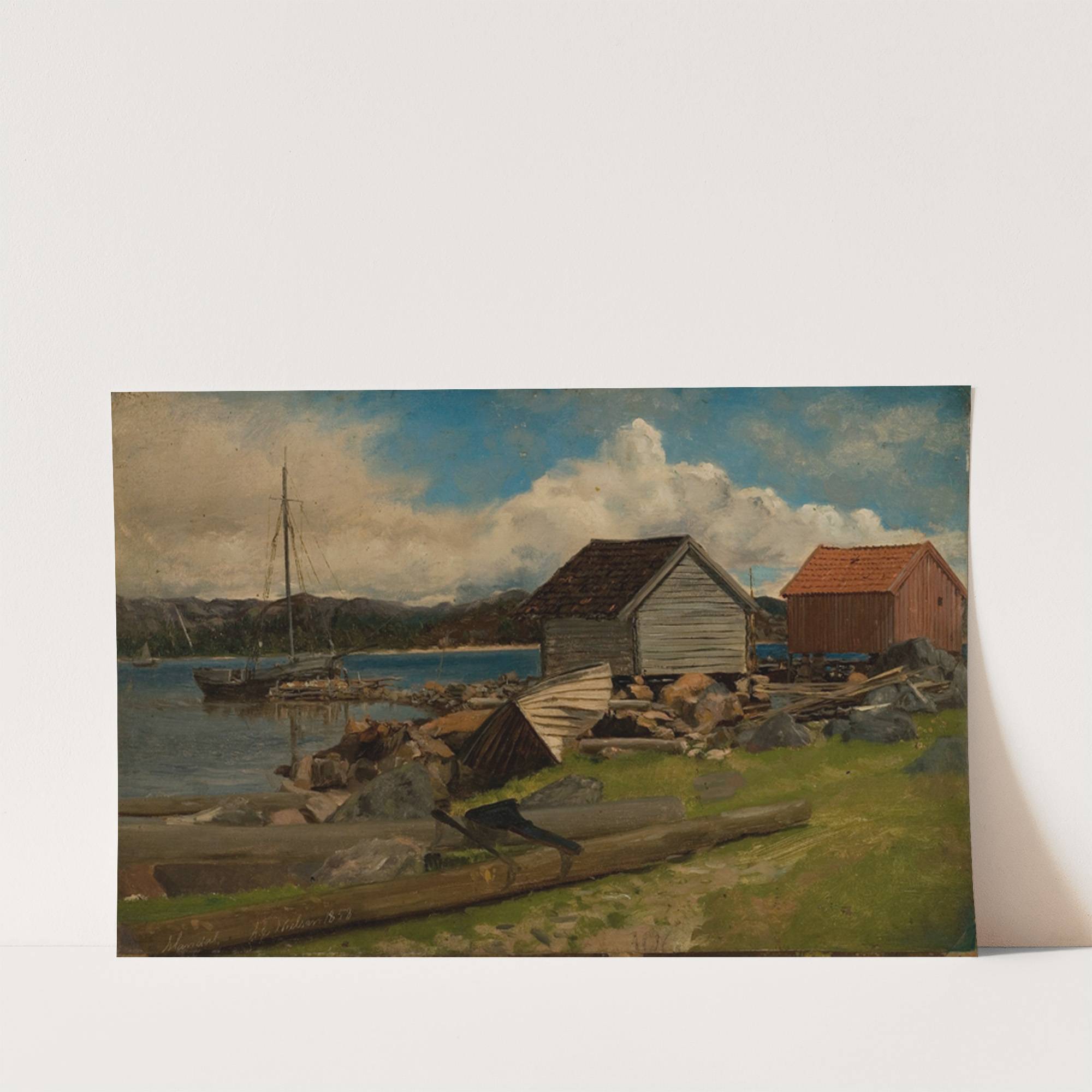 This vibrant landscape print features "Mandal" by Amaldus Nielsen, capturing the serene beauty of a coastal scene. Dominated by warm earth tones, the image depicts an array of wooden structures along a rocky shoreline. A weathered gray boathouse with a...