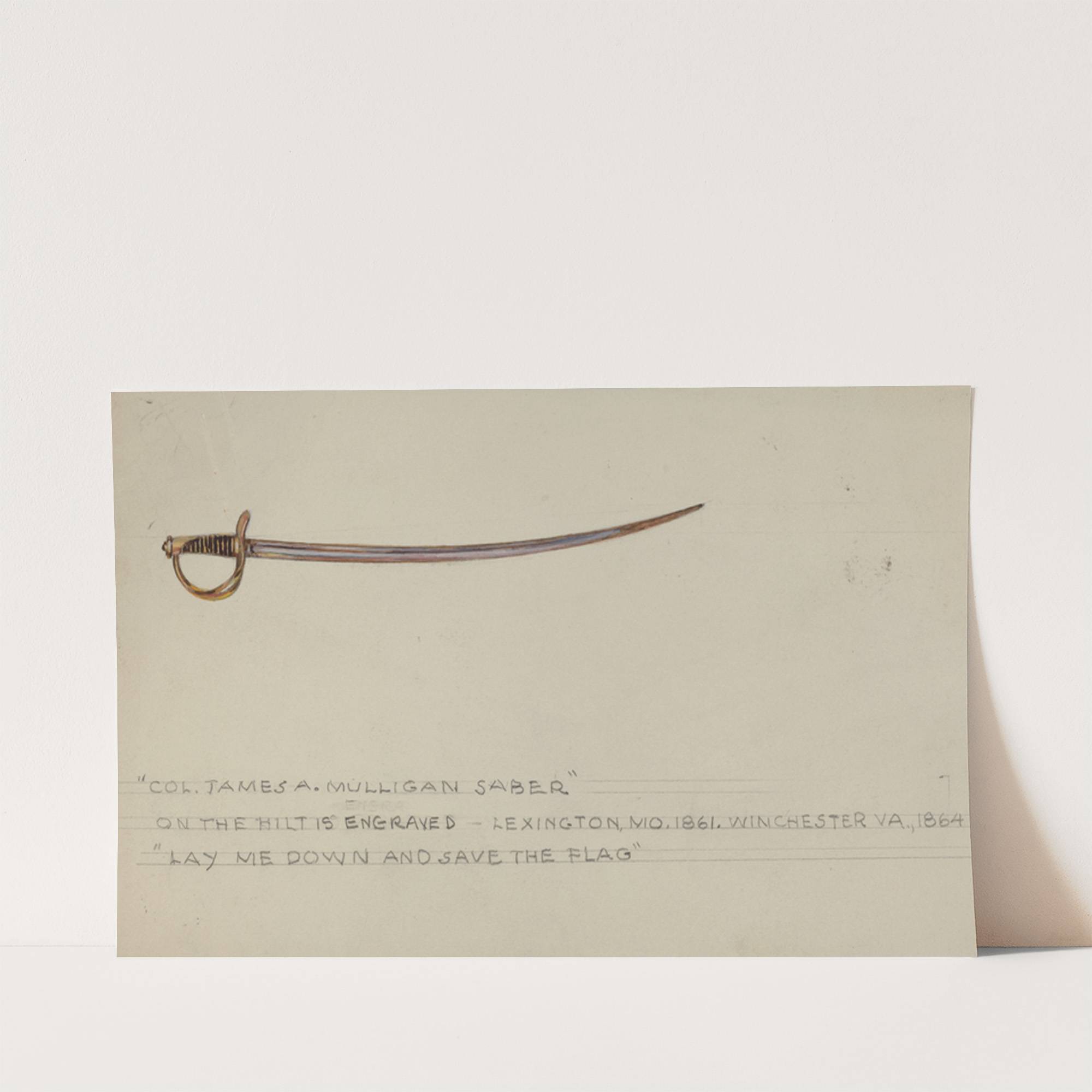 This art print showcases a meticulously detailed illustration of a historical sabre, presented in a classic monochromatic style with subtle color accents. The sword features a gracefully curved blade with a finely textured edge and an elegantly shaped hilt, complete...