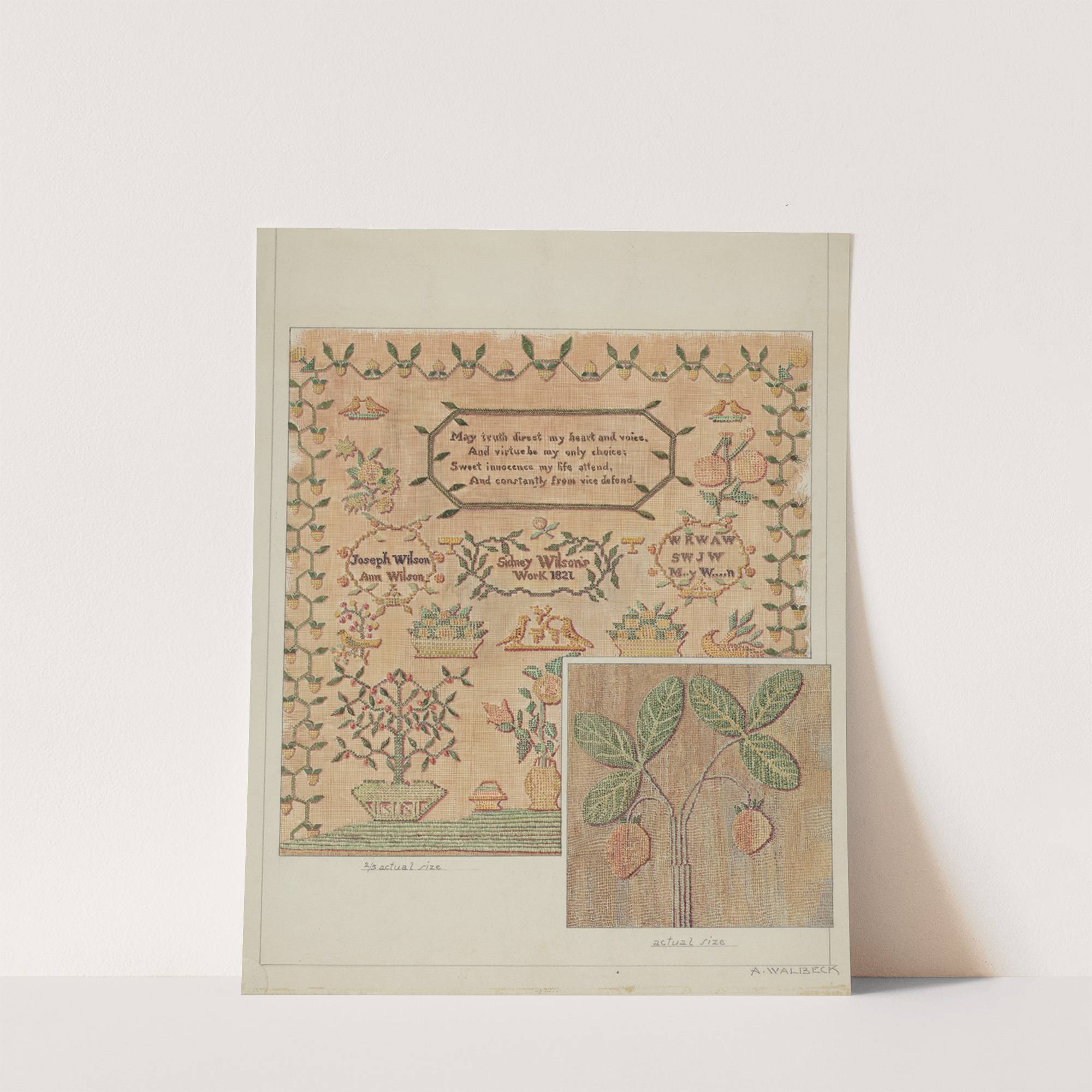 Introduce your home to the charm of this vintage botanical illustration titled "Sampler" by Alfred Walbeck. This beautifully crafted piece features an intricate border of small green leaves that encircle a central medallion filled with delicate, hand-stitched embroidery in muted...