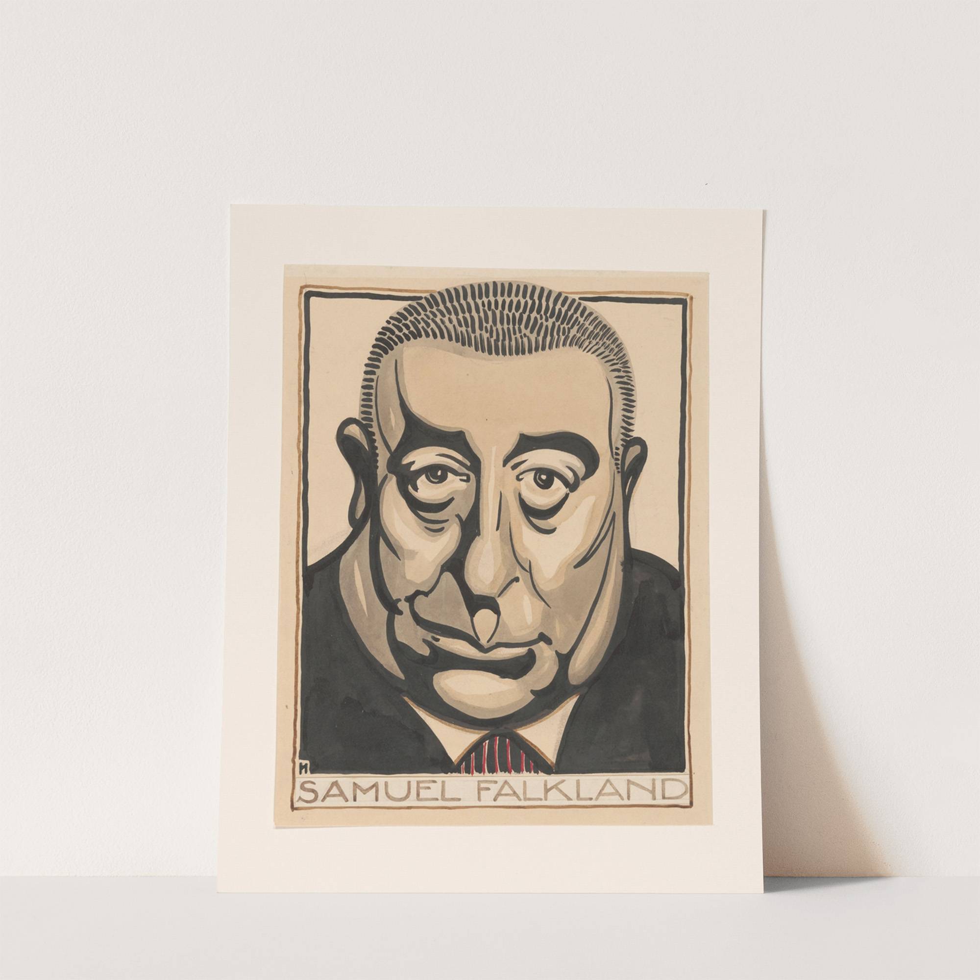 This art print features a stylized portrait of Samuel Falkland by renowned artist Albert Hahn. The image employs a bold, cartoon-like style with strong lines and exaggerated facial features, capturing an expressive likeness of the subject. The color palette is...