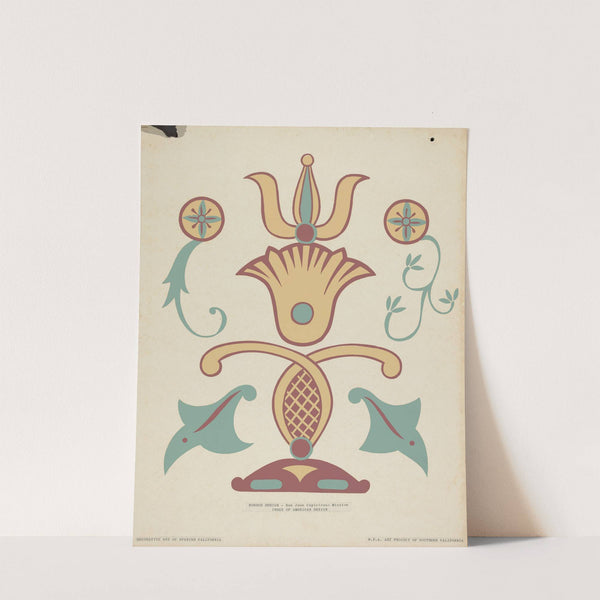 Introducing "San Juan Capistrano Mission Border Design" from the Decorative Art of Spanish California collection. This vibrant art print showcases a beautifully detailed, stylized depiction of a traditional Spanish mission motif. The central element features an elegant, golden fan-shaped design...