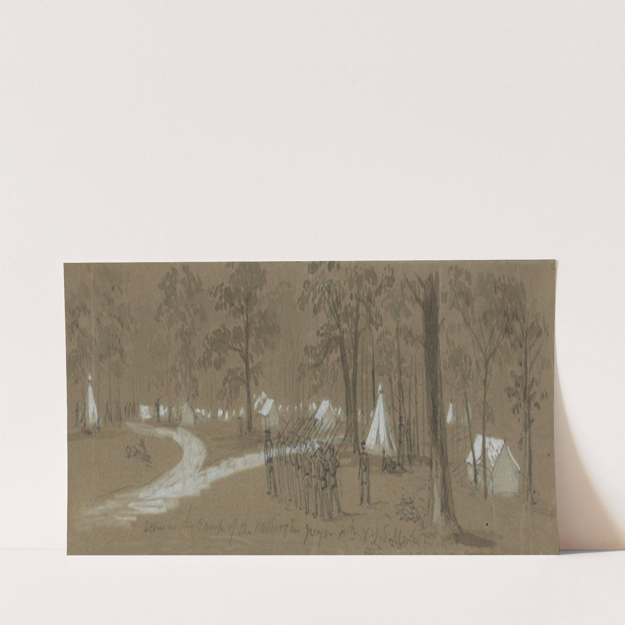 "Scene in the Camp of the Washington Greys: 8th N.Y.S.M." is a captivating art print depicting a historical military encampment. Rendered in muted, sepia-toned colors, this illustration captures the essence of mid-19th century army life with remarkable detail and realism....
