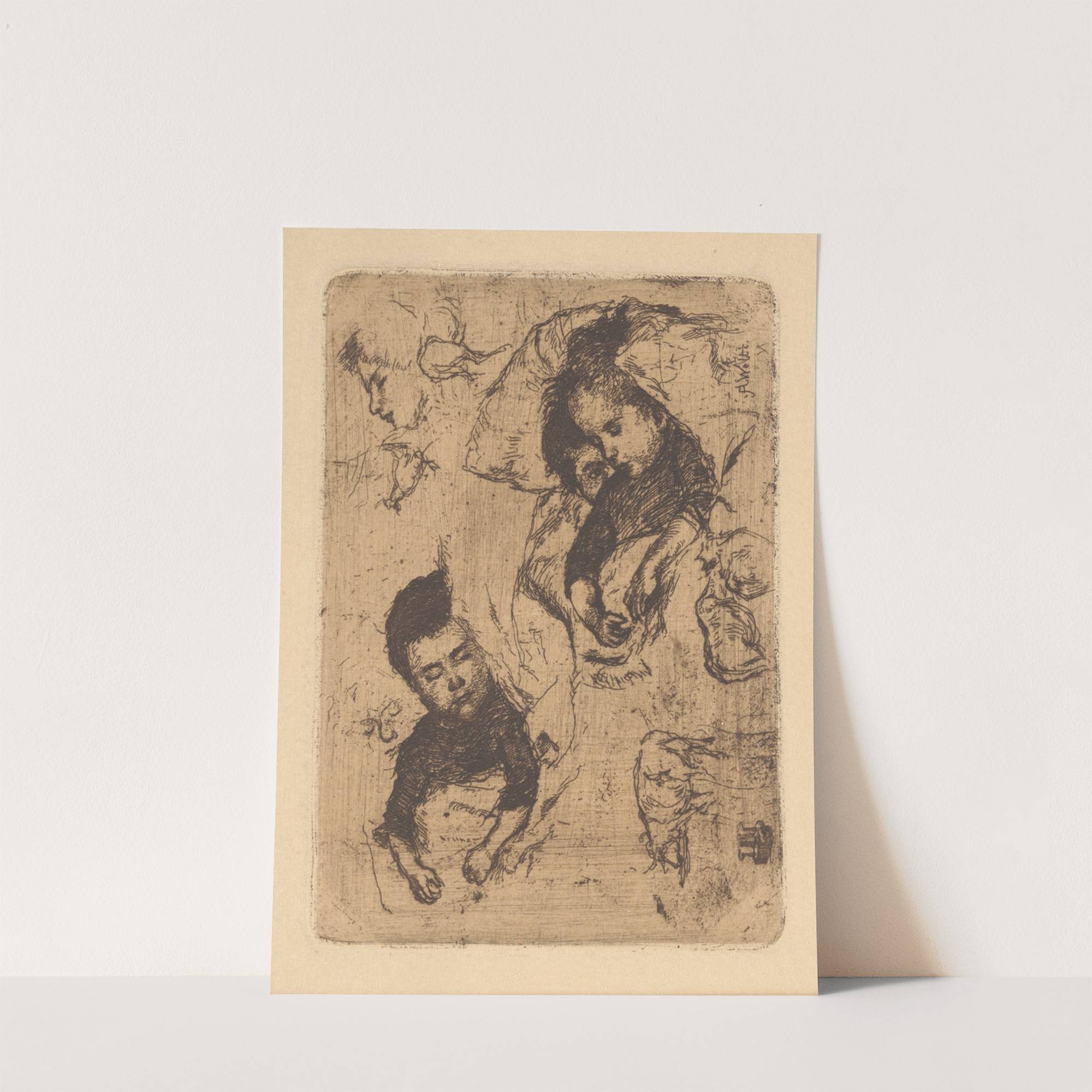 This exquisite print features "Schlafende Kinder" (Sleeping Children), an artwork by renowned artist Albert Welti created in 1893. The piece is rendered in delicate sepia tones, giving it a timeless, vintage quality that highlights Welti's skillful use of line and...