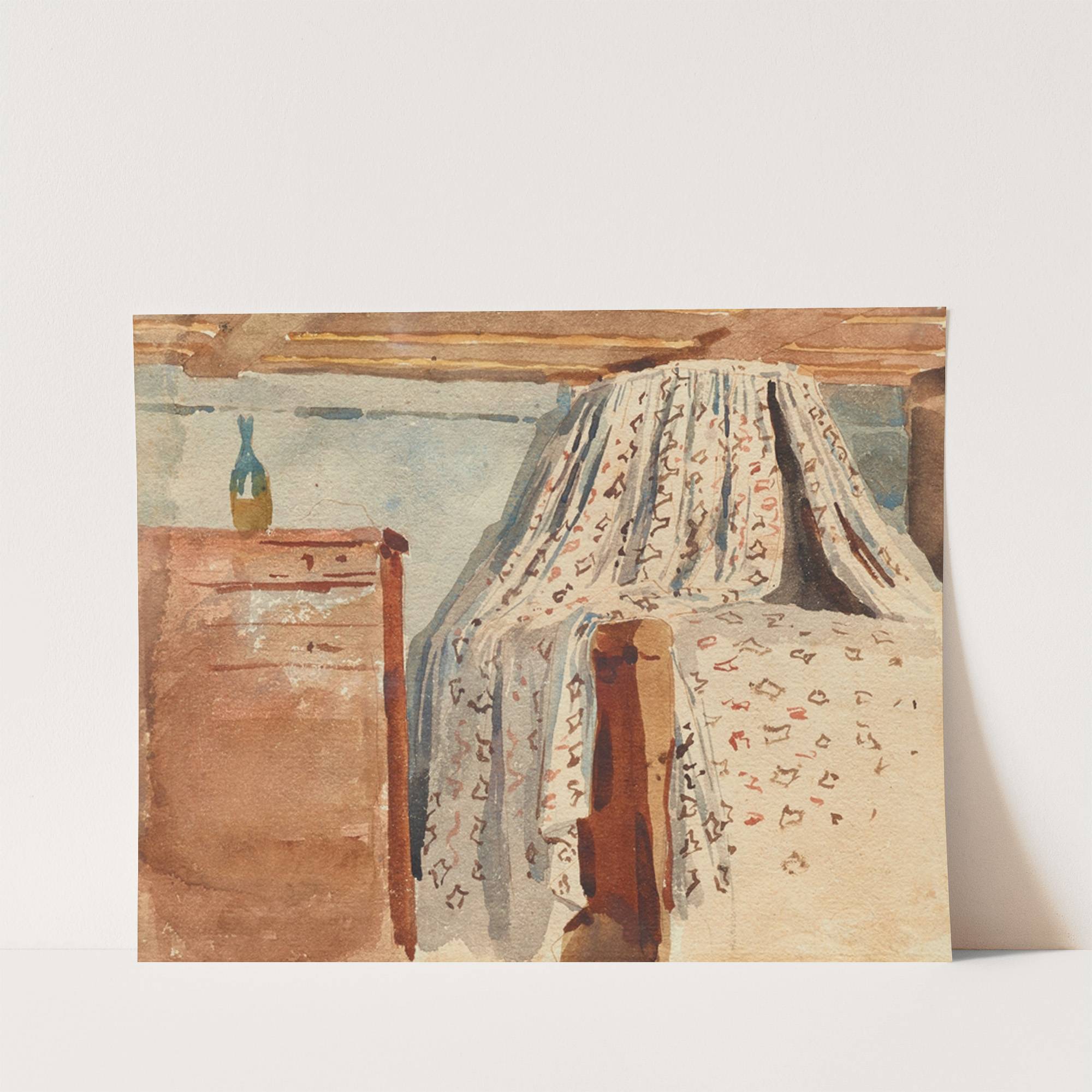 This artwork by Albert Anker captures a serene bedroom scene with soft, inviting hues and delicate brushstrokes. The focus is on a bed draped in a white quilt adorned with small, red and blue geometric patterns. The quilt cascades gracefully...