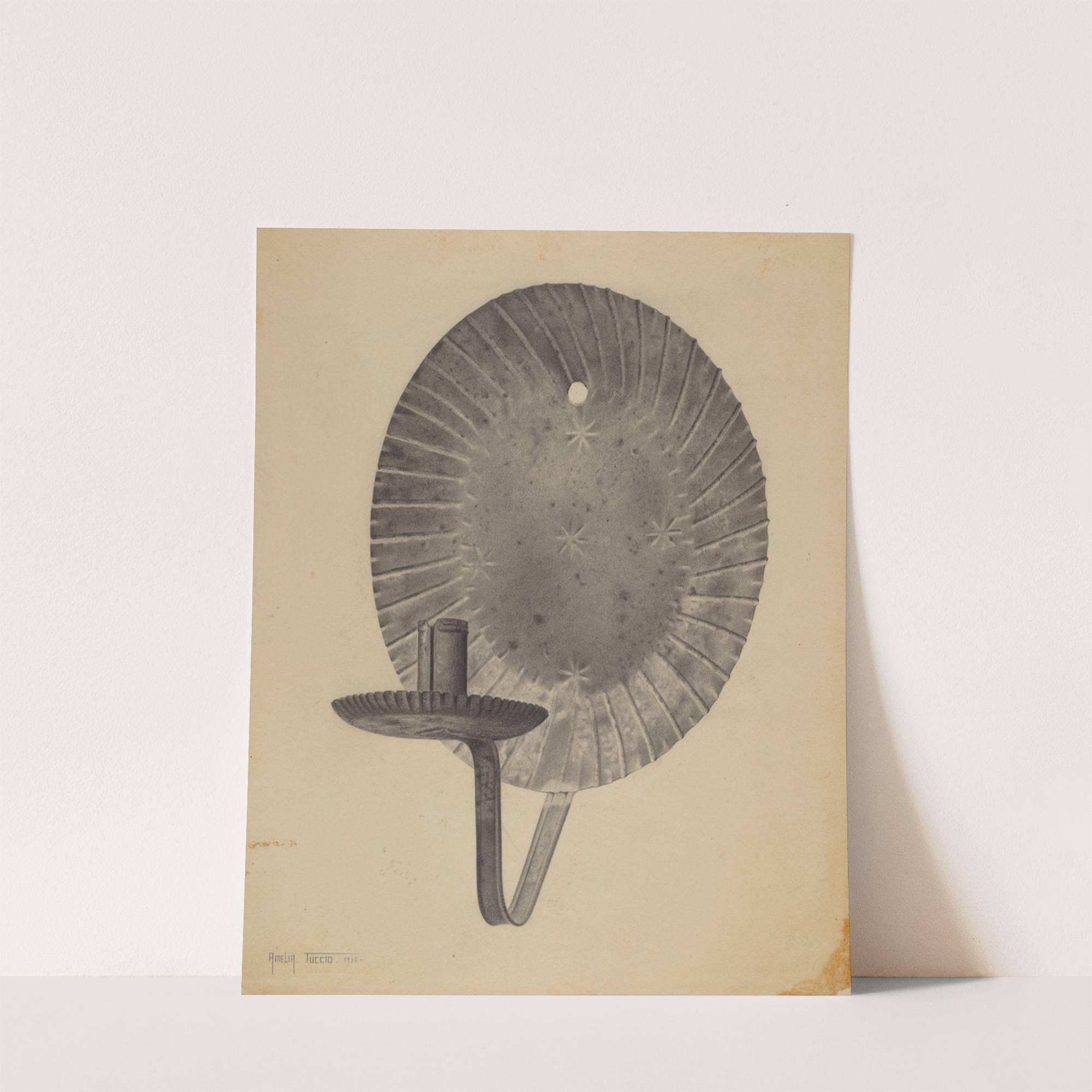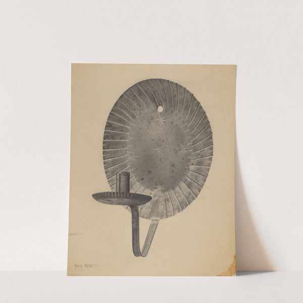 This art print titled "Sconce" by Amelia Tuccio features a meticulously detailed illustration of an old-fashioned sconce. The focal point is the circular metal disc, rendered in shades of grey with a slightly textured surface that suggests wear and age....