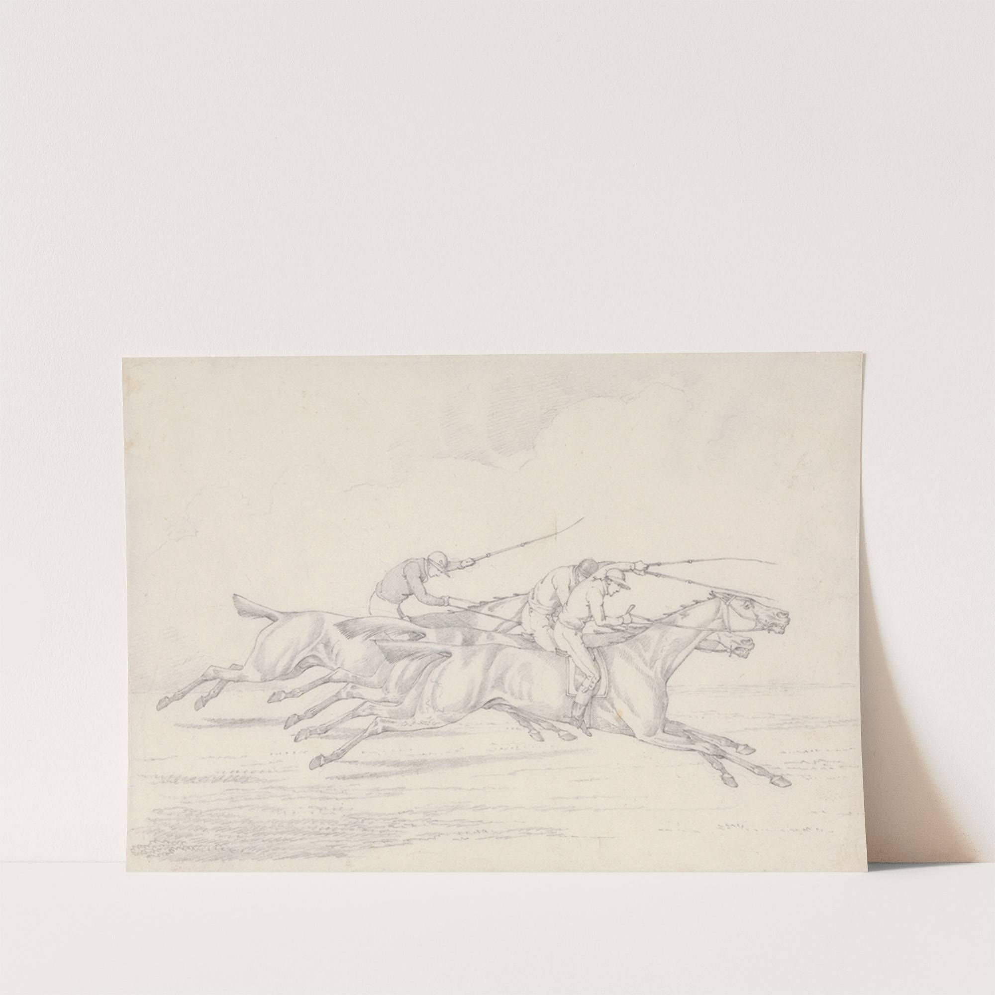 Experience the dynamic energy of racing with "Scraps," a stunning monochromatic pencil drawing by Henry Thomas Alken. This art piece captures three determined jockeys on horseback, galloping fiercely towards the right side of the frame. The horses' powerful strides and...