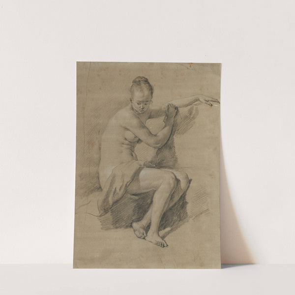 This artwork is a classic drawing titled "Seated Female Nude" by Adriaen van de Velde. Rendered in delicate pencil on aged paper, the piece captures a young woman seated with a contemplative expression. Her hair is neatly tied back in...