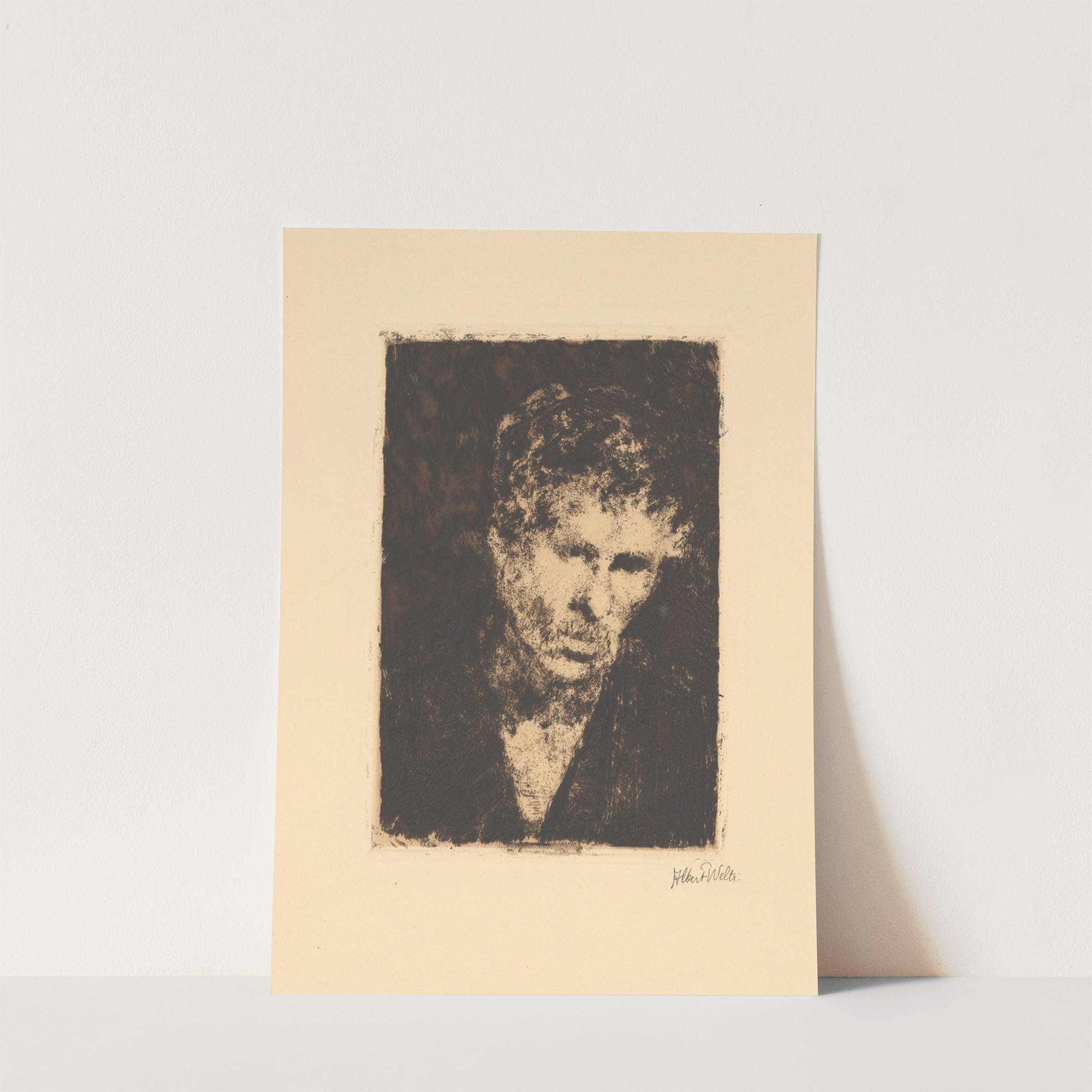 This artwork is a striking self-portrait titled "Selbstbildnis" created by the artist Albert Welti in 1900. Executed in an expressive monochromatic palette of deep black and creamy white, this piece captures a profound introspective mood. The portrait features a young...