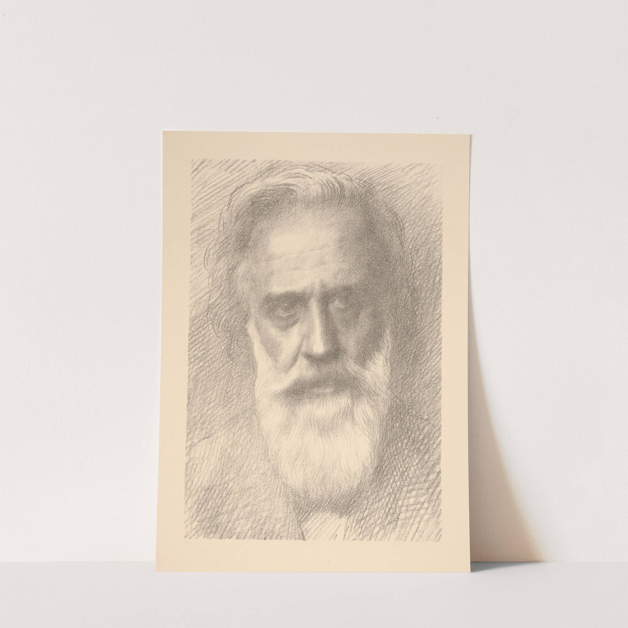 This is a captivating black-and-white pencil sketch titled "Self-Portrait" created by the renowned artist Alphonse Legros in 1898. The piece features a deeply introspective and thought-provoking portrayal of an elderly man with a thick, white beard that extends down to...