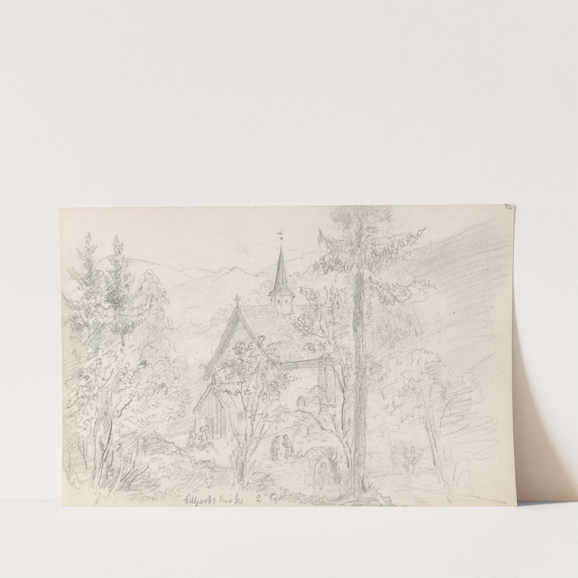 This stunning black-and-white artwork is titled "Seljord Kirke (1857)" by the renowned artist Adolph Tidemand. It presents a serene and delicate scene of a quaint church nestled within a forest. The drawing features light, airy lines that bring to life...