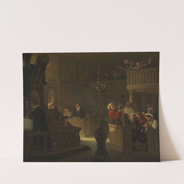 This stunning art print captures the essence of "Service in a Norwegian Country Church" by Adolph Tidemand. The painting, rich in historical detail, depicts a serene church interior bathed in warm, dim light. At the center, a woman with blonde...