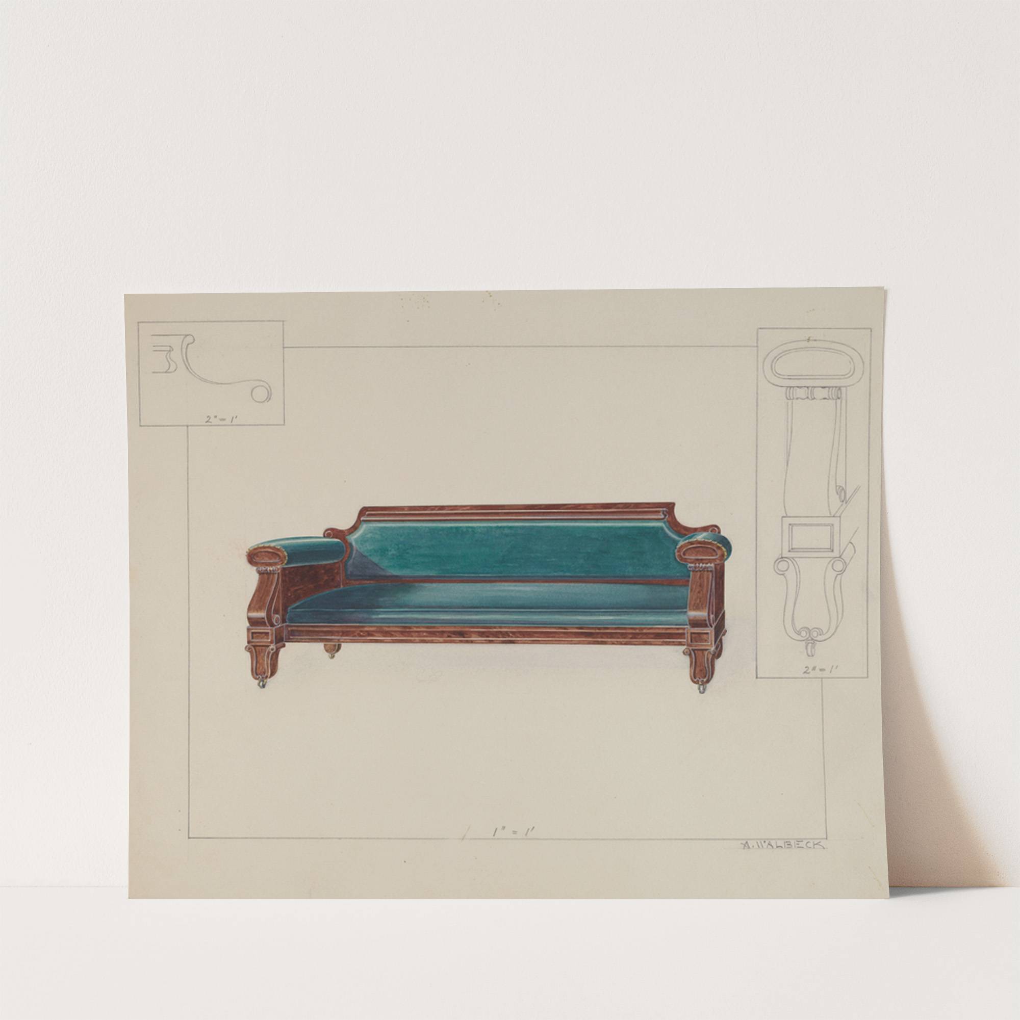 This art print features a meticulous architectural drawing of a classic Victorian-era settee. The illustration is done in a traditional watercolor style, showcasing the elegant wooden frame with intricate carvings on the armrests and legs. The frame is richly colored...
