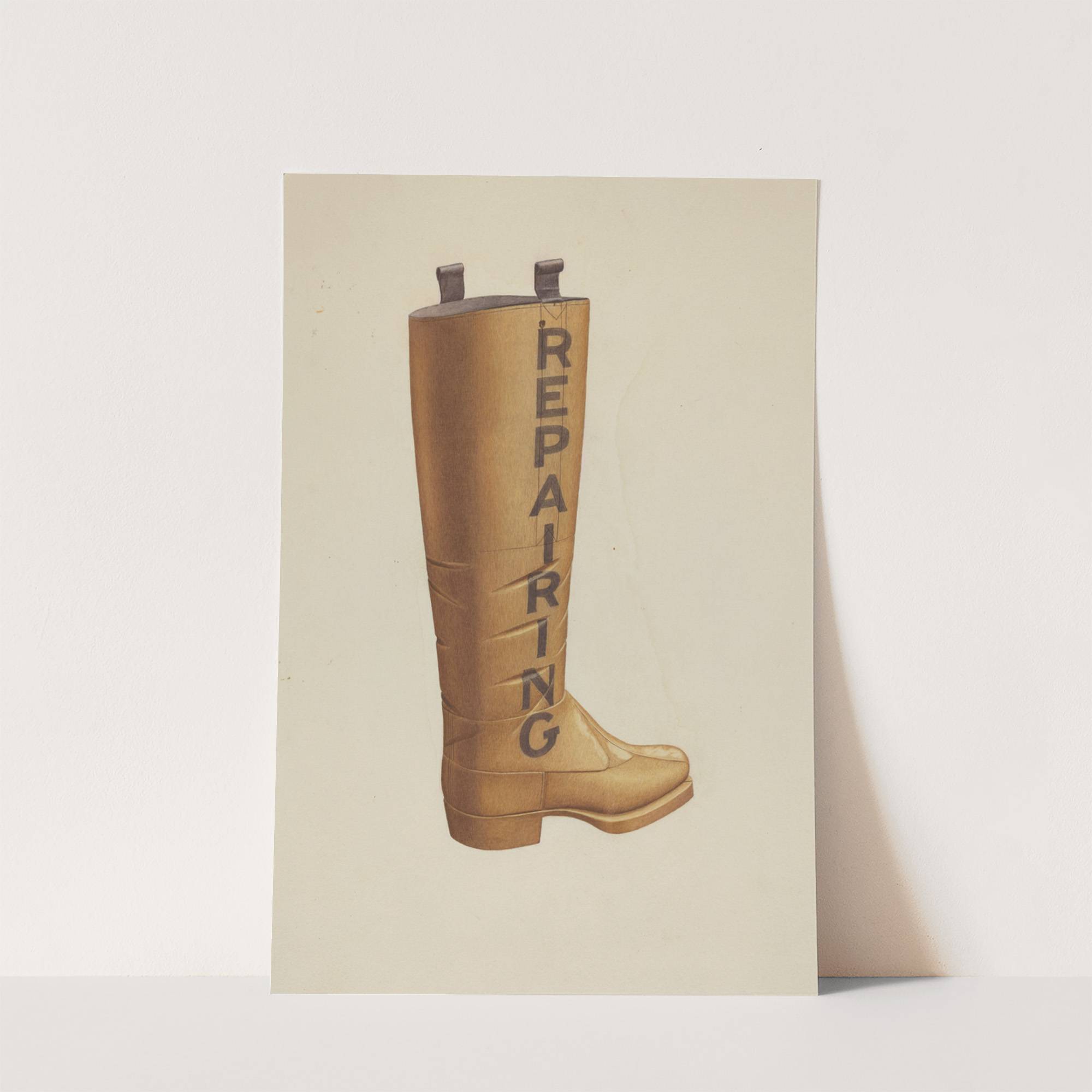 This striking art print features "Shop Sign" by Albert Ryder, showcasing a tall, tan-colored cowboy boot prominently displayed against a simple white background. The boot is rendered in rich, warm hues with subtle shading that highlights its leather texture. The...