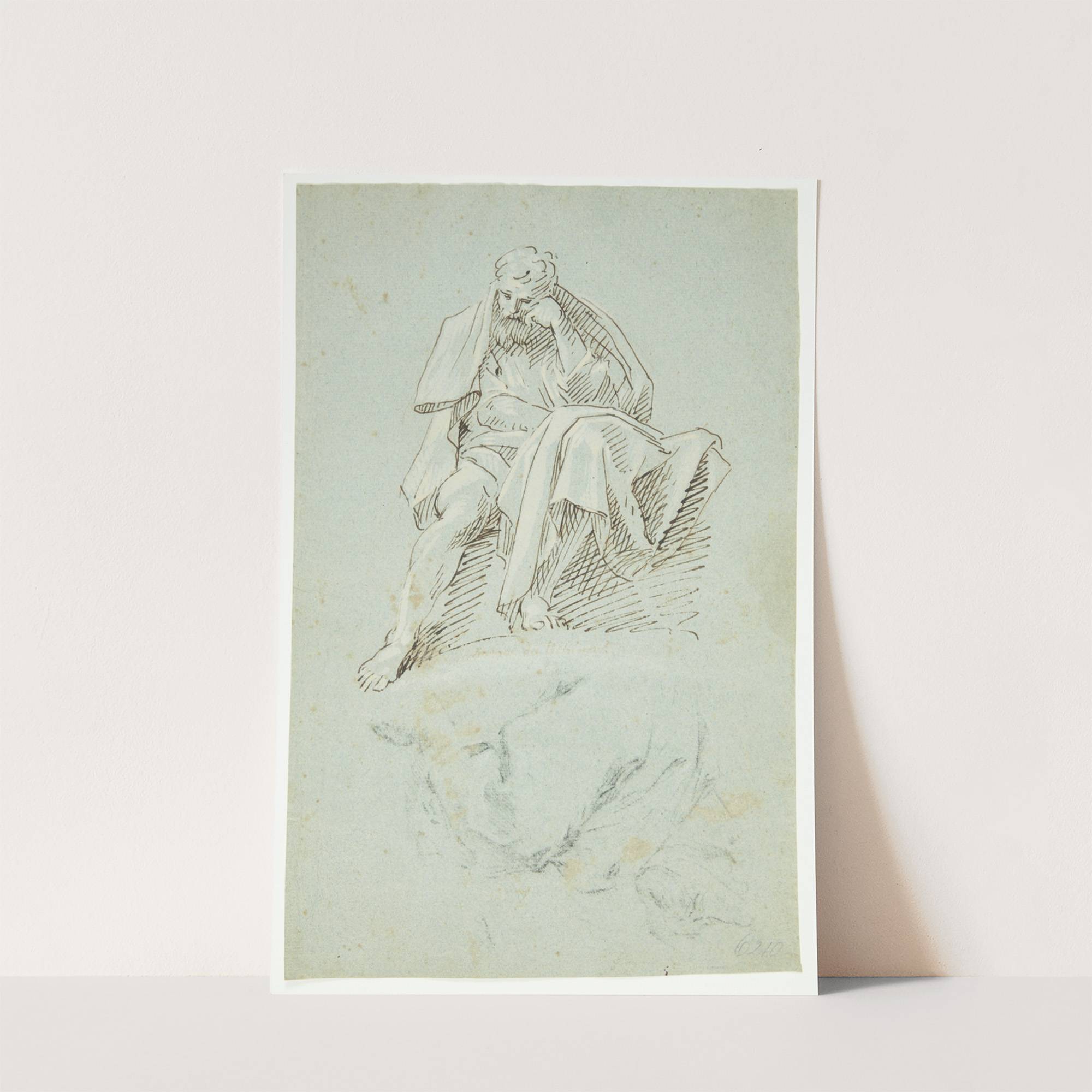 This intricate pencil drawing showcases "Apostel" by the artist Andrea Sacchi in a classic style. The subject is an apostle, depicted with a thoughtful expression as he sits gracefully on a rocky outcrop. His head rests gently on his left...