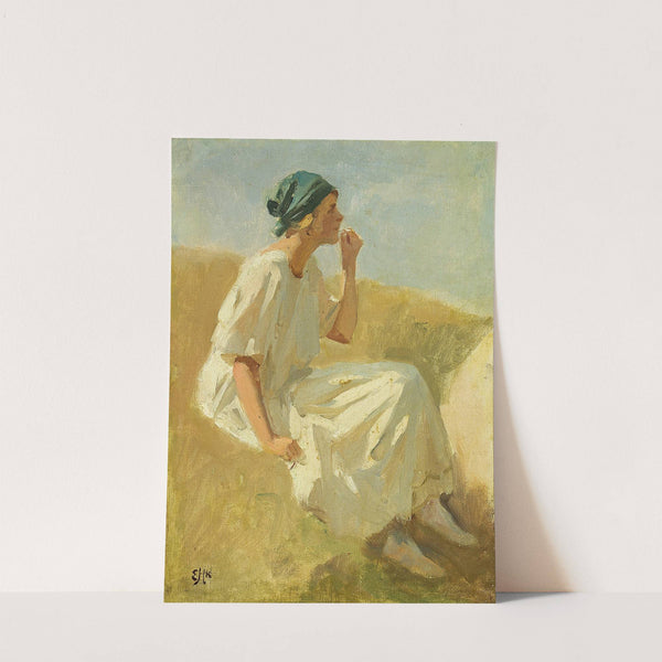 Siddende ung pige med grønt tørklæde by Erik Henningsen - Wall Art Print