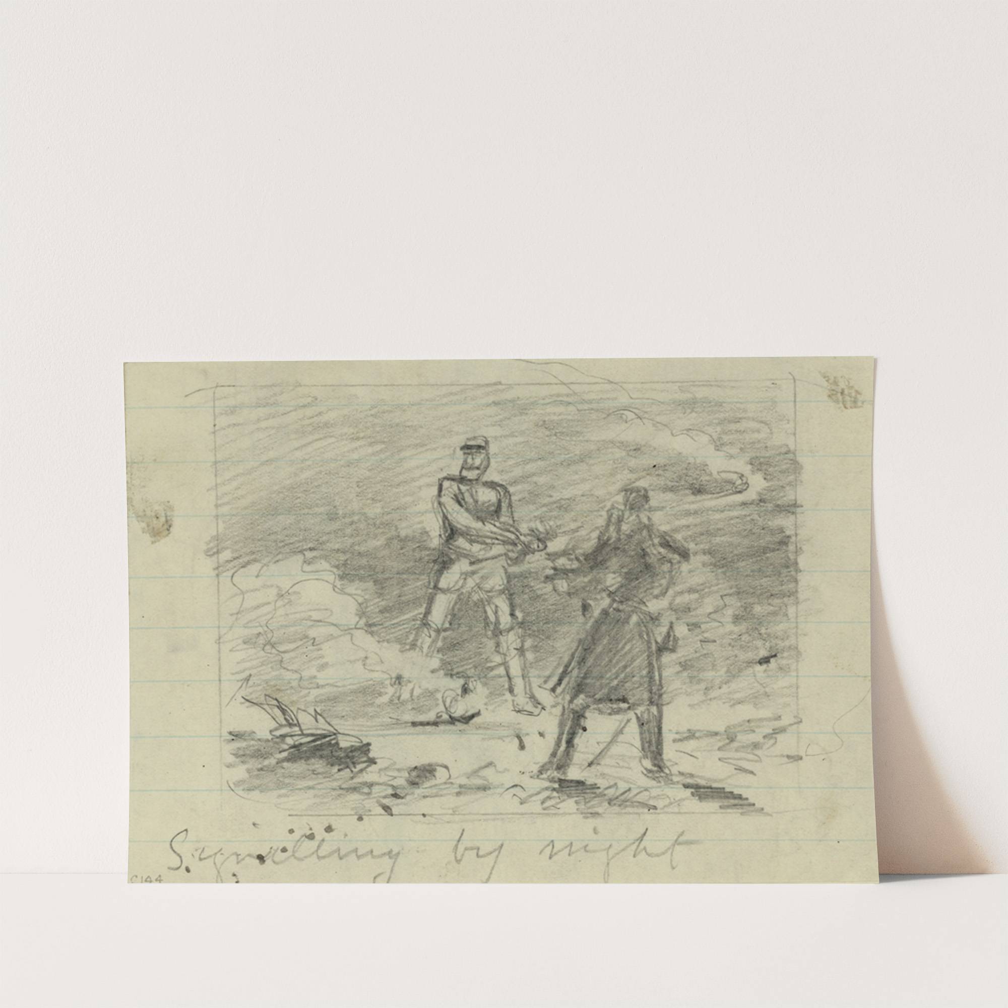 This art print features "Signaling by Night" by Alfred Rudolph Waud, rendered in a sketch-like monochromatic pencil drawing style. The scene depicts two figures in the midst of a war-torn landscape. One figure stands tall to the left, dressed in...