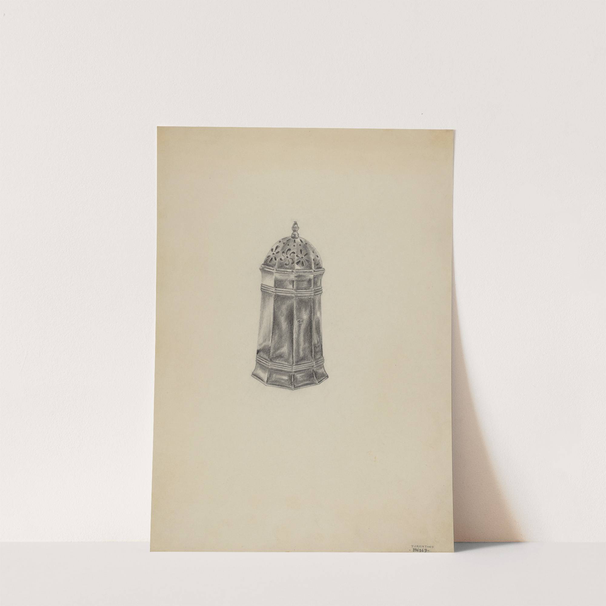 This beautifully detailed black-and-white drawing, titled "Silver Caster" by artist John Tarantino, features a meticulously rendered vintage silver trash can with intricate detailing. The trash can is depicted standing upright and centered against an off-white background that emphasizes the clarity...