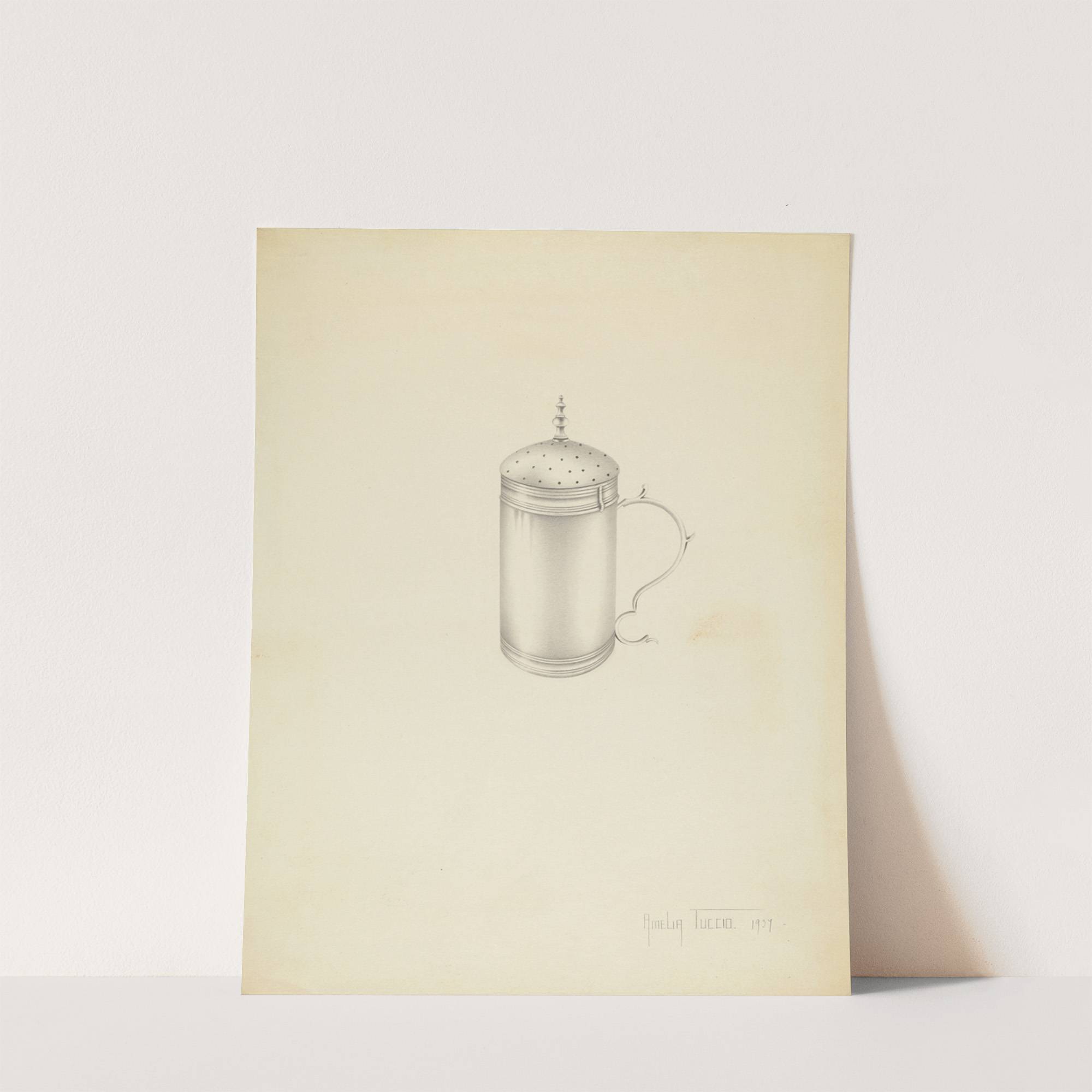 This minimalist art print features "Silver Caster" by Amelia Tuccio, showcasing a delicate, transparent beer stein rendered in a soft monochrome palette. The clear glass stein is depicted with fine details: the perforated lid at the top, the curved handle...