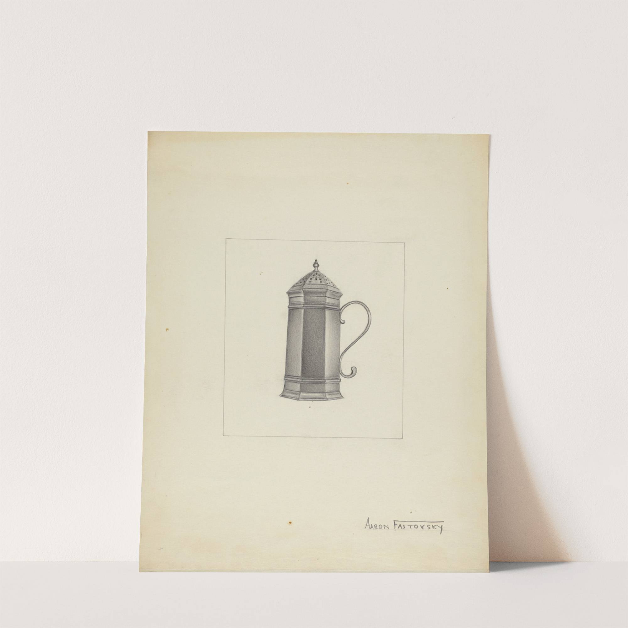 This art print features "Silver Salt Cellar" by Aaron Fastovsky, showcasing a meticulously detailed drawing of an antique-style silver pitcher or jug. The pitcher is centered within a rectangular frame, with delicate shading and cross-hatching techniques that highlight its metallic...